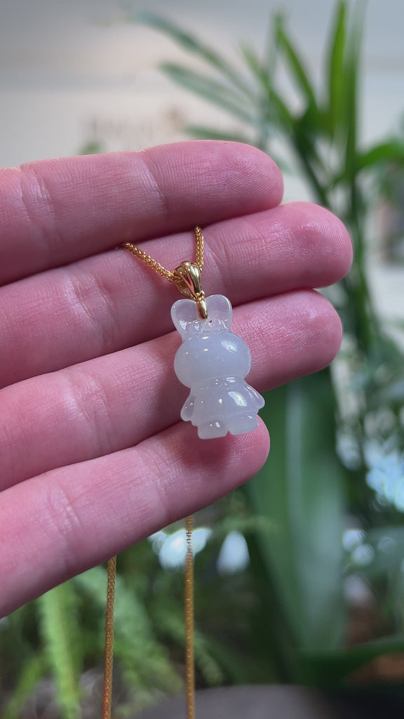 * Design Concept--- Introducing our unique and charming natural Burmese jadeite jade pendant carved into Lucky Bunny. The jade features an icy white-green color throughout with a smooth and translucent texture. The pendant is finished with a simple 18k yellow gold bail. The intricate details of Lucky Bunny's adorable face and signature bow add a touch of whimsy and fun to this already remarkable piece. Jadeite jade is known for its durability, also believed to bring good luck. This pendant is perfect for any Lucky Bunny enthusiast or collector of unique jewelry.