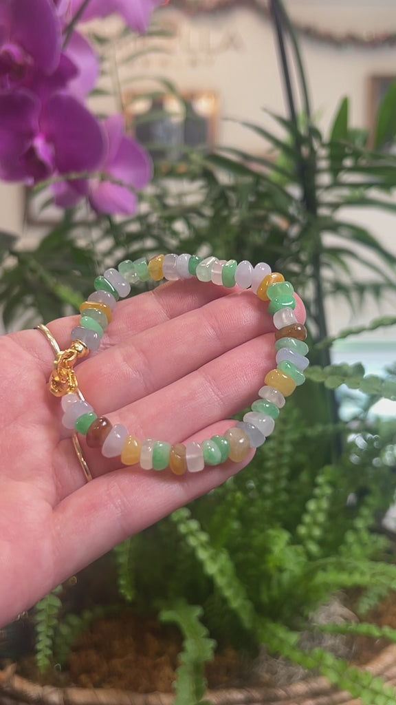 * DETAILS---This bracelet is made with fine quality, natural Burmese jadeite jade beads in a mix of green, lavender, yellow, and white colors that are in a free-form shape. The bracelet is finished with a yellow gold plated sterling clasp, dazzled with cubic zirconium and synthetic red ruby. Known for its durability, jadeite is also believed to bring good luck. Whether as a gift for yourself or a loved one, this jade beaded bracelet is a meaningful piece.