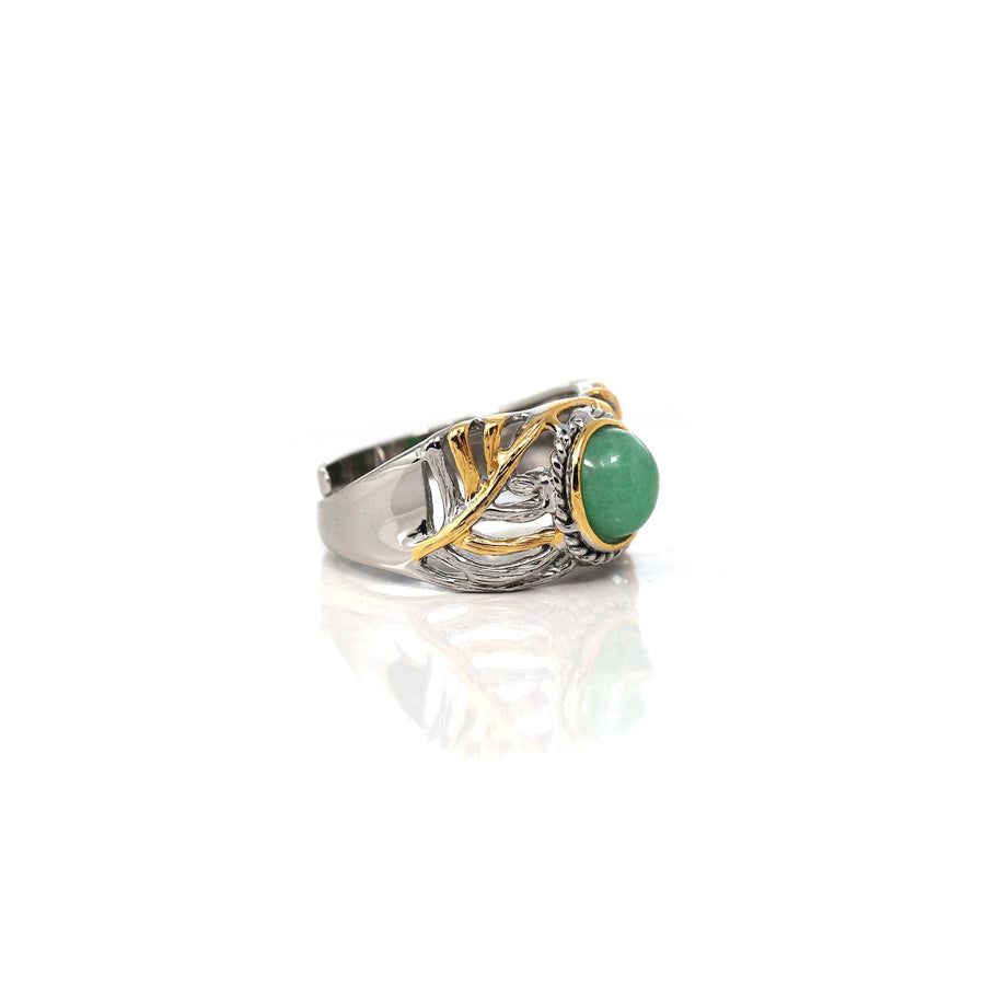 Crafted in a vintage-inspired design, this ring pays homage to the classics while adding a modern touch. The natural jadeite jade centerpiece, with its captivating hues, is embraced by intricate sterling silver detailing, accented by delicate gold plating. This ring is not just an accessory; it's a piece of history, a symbol of good luck, fortune and peace. Elevate your style with this unique treasure, perfect for both special occasions and everyday elegance.