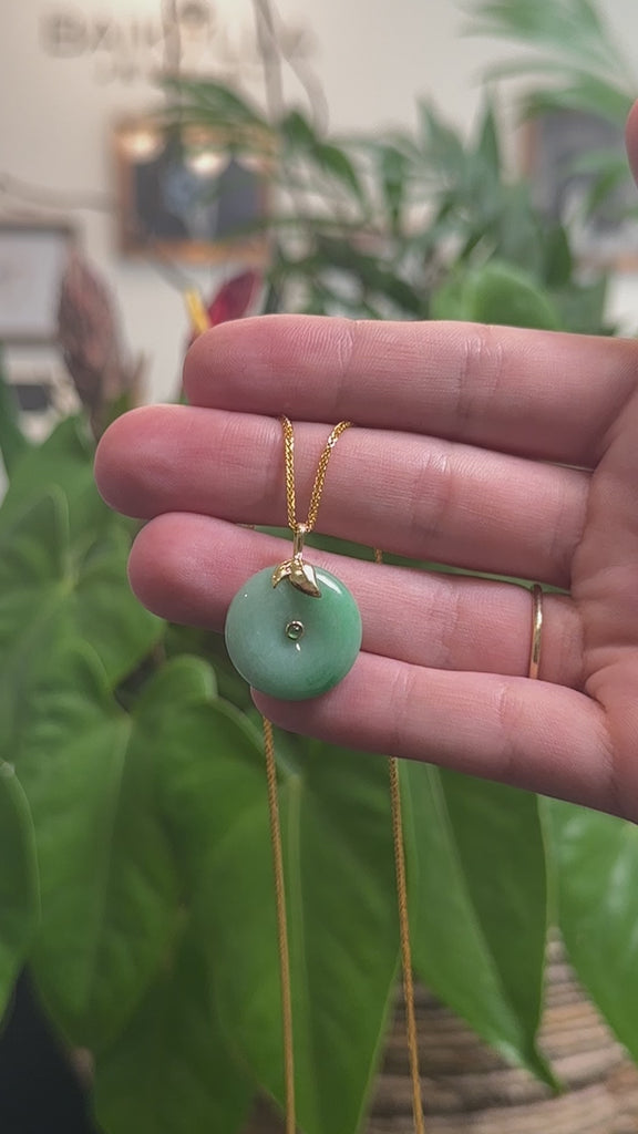 * Design Concept--- The Ping An Kou (Good Luck Button) is a Chinese symbol of peace, protection and well-being, believed to ward off negative energy and bring good fortune. This necklace is made with very high-quality genuine Burmese green jadeite jade with a 18K solid gold leaf themed bail. The center has an imperial jade set in 18k gold. Gifting one of these is like wishing the best of luck to your family or loved ones. It's a significant gift.