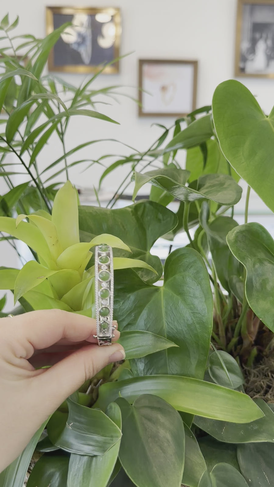 * INTRODUCTION--- This beautiful art deco style hinge bracelet features a nephrite jade cabochons in the middle and lined with brilliant zircons down the sides. Paired with beautiful filigree down the back side of the bracelet. Adding interest to your bracelet. Elevate your style with the sterling silver jade design that is found no where else.
