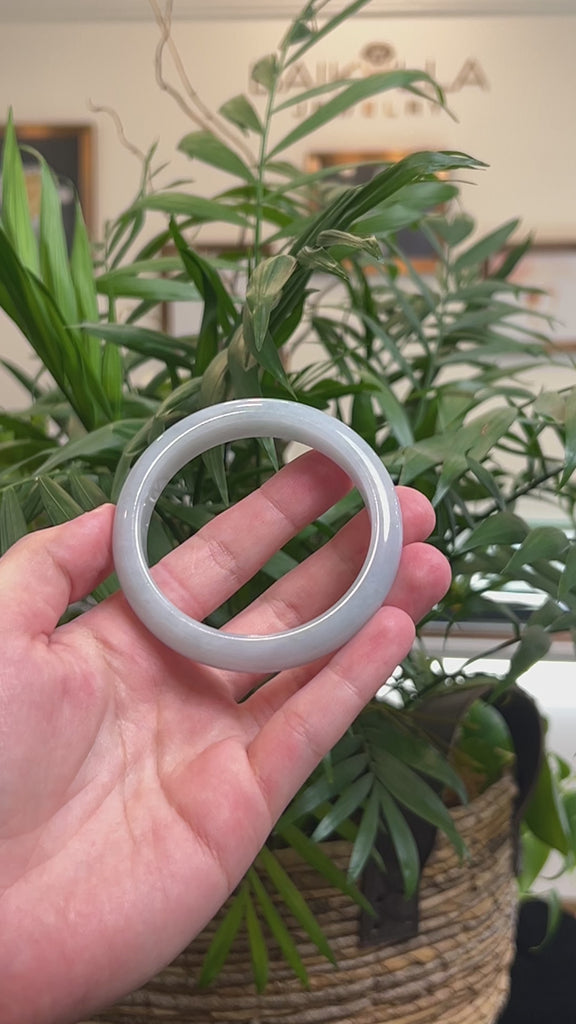 * DETAILS--- This bangle is crafted from genuine Burmese Jadeite jade. It features soft white-blue and green color throughout with a small patch of "Sajin"(Golden Dust) that adds to it's unique and natural beauty. The texture is smooth and semi-translucent texture with no natural lines and minimal cloudy spots. It's a half round, comfort-fit bangle, which is flat on the inside and comfortable for everyday wear, this bangle has a slightly wider width than standard which makes for a bolder look. Known for its durability, jadeite is also believed to bring good luck. This bangle makes a thoughtful and meaningful gift for yourself or someone special.