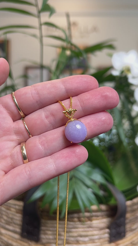 * Design Concept--- This pendant is crafted from natural, genuine Burmese jadeite jade, showcasing a beautiful "Vixen" purple-lavender color throughout. In jadeite, “Vixen” refers to a vivid, saturated purple hue, prized for its richness and depth. The jade in set in solid 18k yellow gold with natural diamonds dazzling the an open back, revealing the jade's beautifully smooth and translucent texture. Completing the design is an an elegant 18k yellow gold bail, accented with natural diamonds. Meaningful and elegant, this pendant makes a special piece to wear or a thoughtful gift for someone special.
