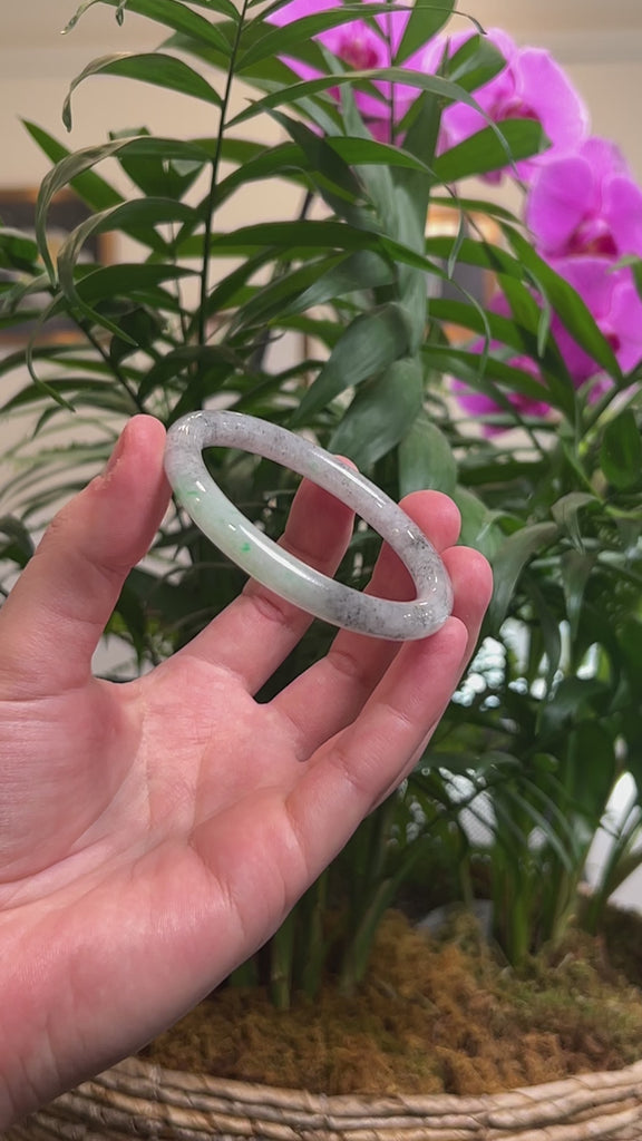 It's a full round, traditional bangle, which is fully round throughout the bangle. This bangle features a more narrow width than standard, creating a more dainty look. Known for its durability, jadeite is also believed to bring good luck. Whether as a gift for yourself or a loved one, this jade bangle is a meaningful treasure that combines natural beauty, lasting craftsmanship, and exceptional value to cherish for years to come.