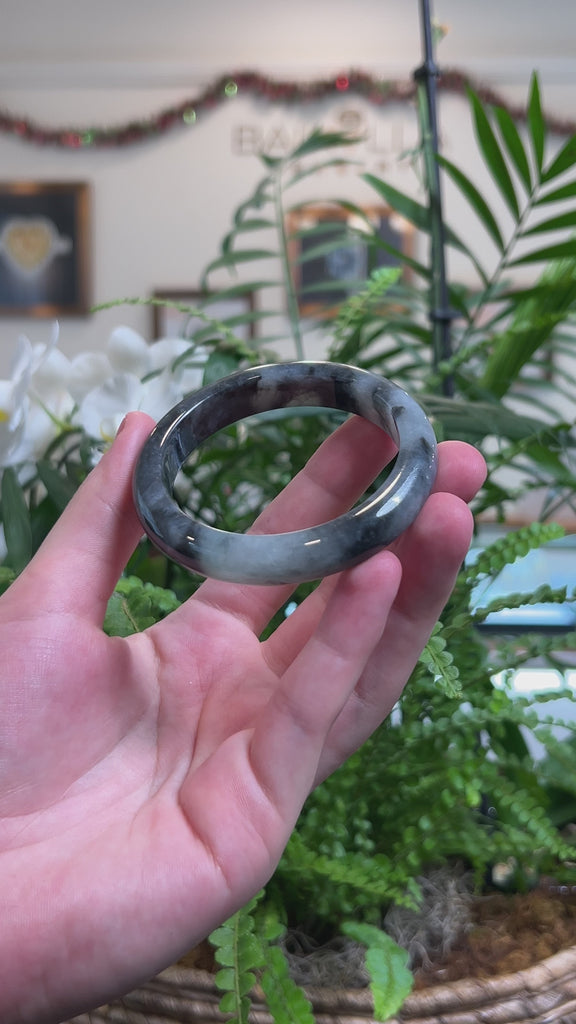 *DETAILS--- This bangle is crafted from natural Burmese Jadeite jade that features a black Wuji color throughout with patches of light green. Wuji (乌鸡), meaning “black chicken,” refers to the distinctive blackish-grey coloration prized in jadeite. The contrast of the deep Wuji and the light green is a mesmerizing combination. The texture is smooth and translucent with no natural lines and minimal cloudy spots.
