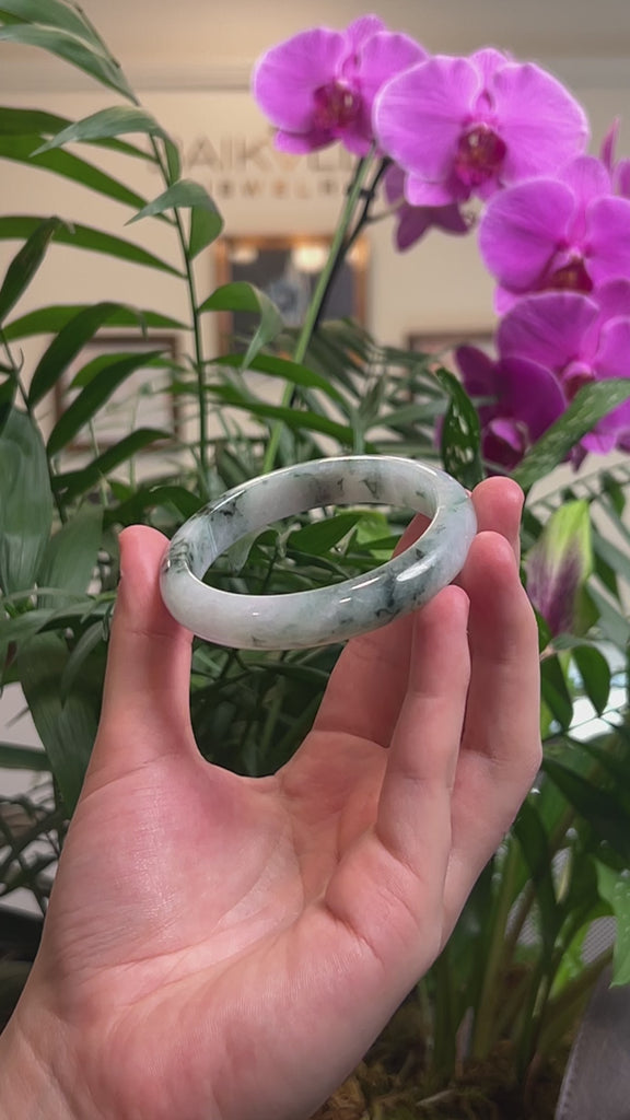 * DETAILS--- This bangle is crafted from genuine Burmese Jadeite jade that features a light green & white base color with gorgeous deep blue-green flowers throughout. The texture is smooth and translucent with minimal lines and cloudy spots. It's a half round, comfort-fit bangle, which is flat on the inside and comfortable for everyday wear. Known for its durability, jadeite is also believed to bring good luck. This bangle makes a thoughtful and meaningful gift for yourself or someone special.