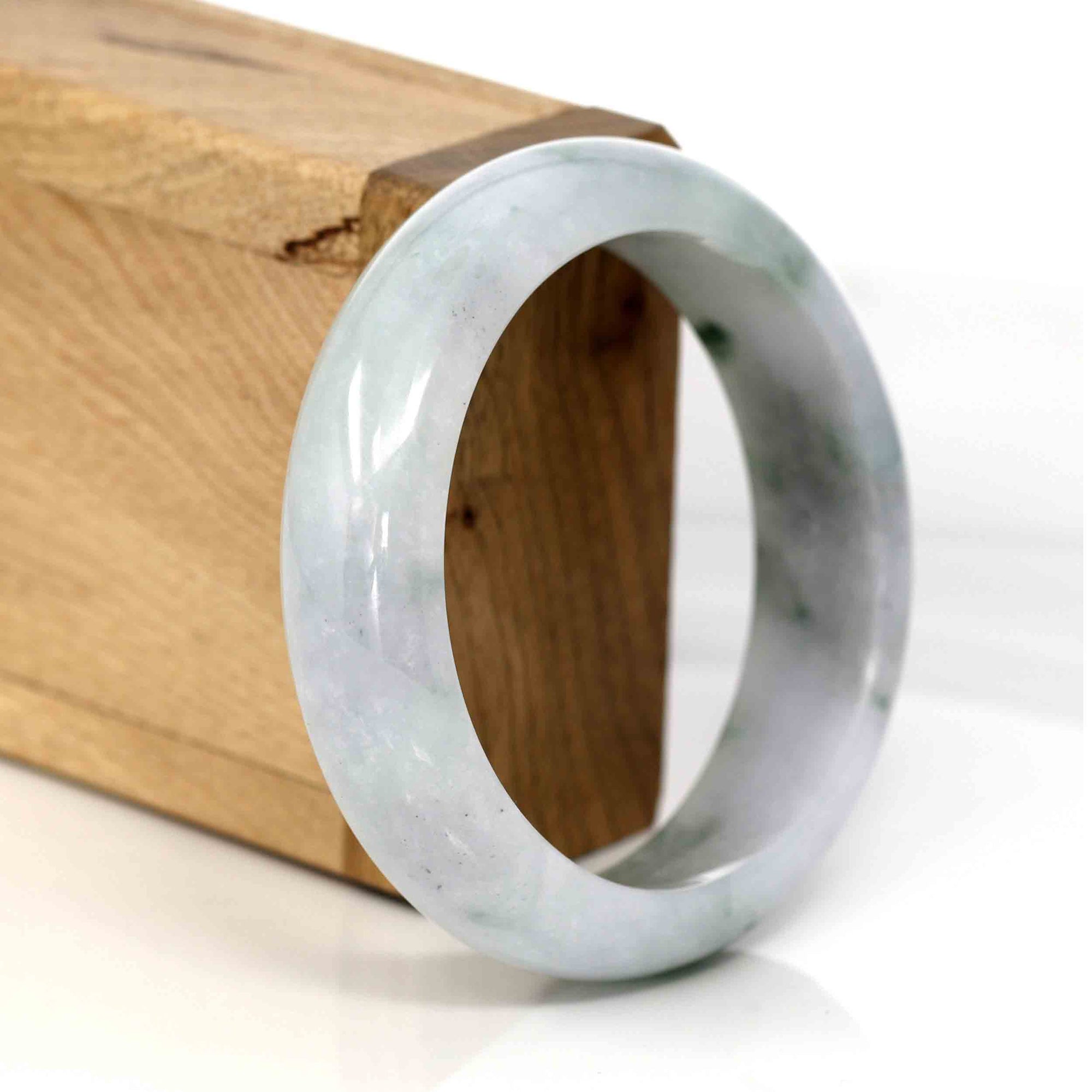* DETAILS--This bangle is made with genuine Burmese Jadeite jade, The jade texture is very smooth and translucent with blue green color. The blue green color looks very nice as landscape painting. It's a very unique bangle. You know the genuine jade bangle is always meaningful for someone. The Classic half-round wider style bracelet. It's a special gift for yourself or your love.