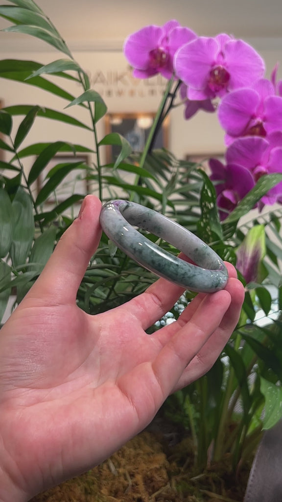 * DETAILS: This bangle is crafted from genuine Burmese Jadeite jade that features a light white base color with deep blue-green flowers all throughout that is truly unique and mesmerizing to look at. The texture is smooth and translucent with some natural lines and cloudy spots that reflects the jade’s genuine character. These organic features also make this piece more accessible and affordably priced, offering exceptional beauty and value.