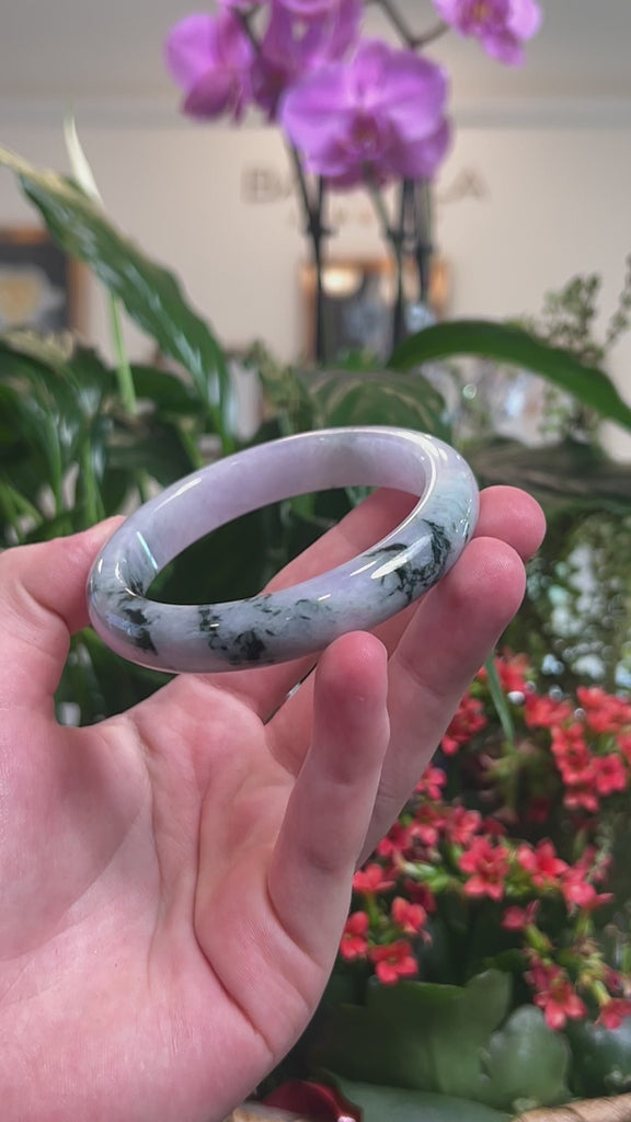 *DETAILS--- This bangle is crafted from natural Burmese Jadeite jade that features a light lavender base color with deep blue-green flowers throughout. The texture is semi-smooth and translucent with minimal natural lines and some cloudy spots.