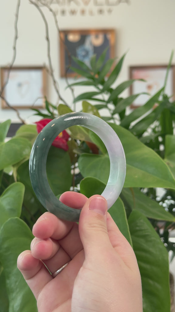 * DETAILS-- This bracelet is crafted from quality, genuine Burmese Jadeite Jade with a mix of light lavender and green tones. The jade’s texture is very smooth and semi-translucent with patches of light lavender and green color mostly on one side and a deep green on the other. No natural lines and minimal cloudy spots. It's a half round, comfort-fit bangle, which is flat on the inside of the bangle and comfortable for everyday wear. Known for its durability, jadeite is also believed to bring good luck. This bangle makes a thoughtful and meaningful gift for yourself or someone special.