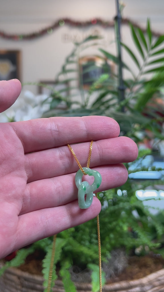 * Design Concept--- The Ping An Kou, or Good Luck Button, is a traditional symbol of peace and protection, believed to bring harmony and good fortune. This pendant offers a fun reinterpretation with its Double Heart KouKou design. This pendant is made with natural Burmese jadeite jade that features a light apple-green color throughout with patches of vivid green. Known for its durability, jadeite is also believed to bring good luck. Gifting one of these is like wishing the best of luck to your family or loved ones.