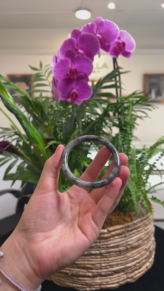 * DETAILS--- This bangle is crafted from genuine Burmese Jadeite jade. It features a black WuJi color, (乌鸡) "black chicken" a blackish grey tone throughout that makes it truly captivating and unique. The jade texture is smooth with some natural lines and cloudy spots that reflects the jade’s genuine character. These organic features also make this piece more accessible and affordably priced, offering exceptional beauty and value. (Similar item sent at random)