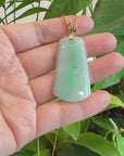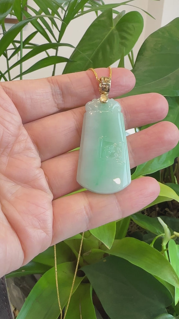 *Design concept--This pendant is made with very high-quality genuine Burmese jadeite jade. The jade texture and color are very good. The style is called "Wu Shi Pai," meaning 'Your everything is coming safe and no bad thing happens to you" The Pai means a pendant. The excellent craftsmanship portrays " Wu Shi Pai" with the dragon. The handcraft is stunning. Great size for both men and women. Setting with designed and special gold bail. Available with optional gold chain.