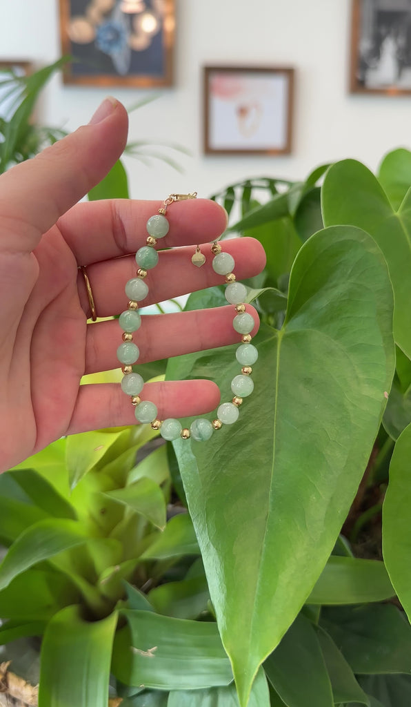 Baikalla Genuine Ice Light Green Jadeite Jade Round Beads Bracelet With 18K Yellow Gold Clasp and Gold Beads ( 7.8 mm )