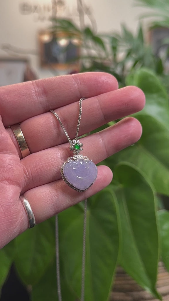 *Design concept-- "Ruyi" in Chinese means "as you wish," symbolizing luck and success. This unique pendant features a timeless good luck charm, crafted from natural Burmese icy lavender jadeite jade that is set in a diamond dazzled 18K white gold setting as well as the 18K white gold bail with diamonds and a vibrant imperial jade center. One of a kind, it’s a meaningful piece for those starting a new chapter in life or beginning a new business. A perfect gift for good fortune and prosperity.