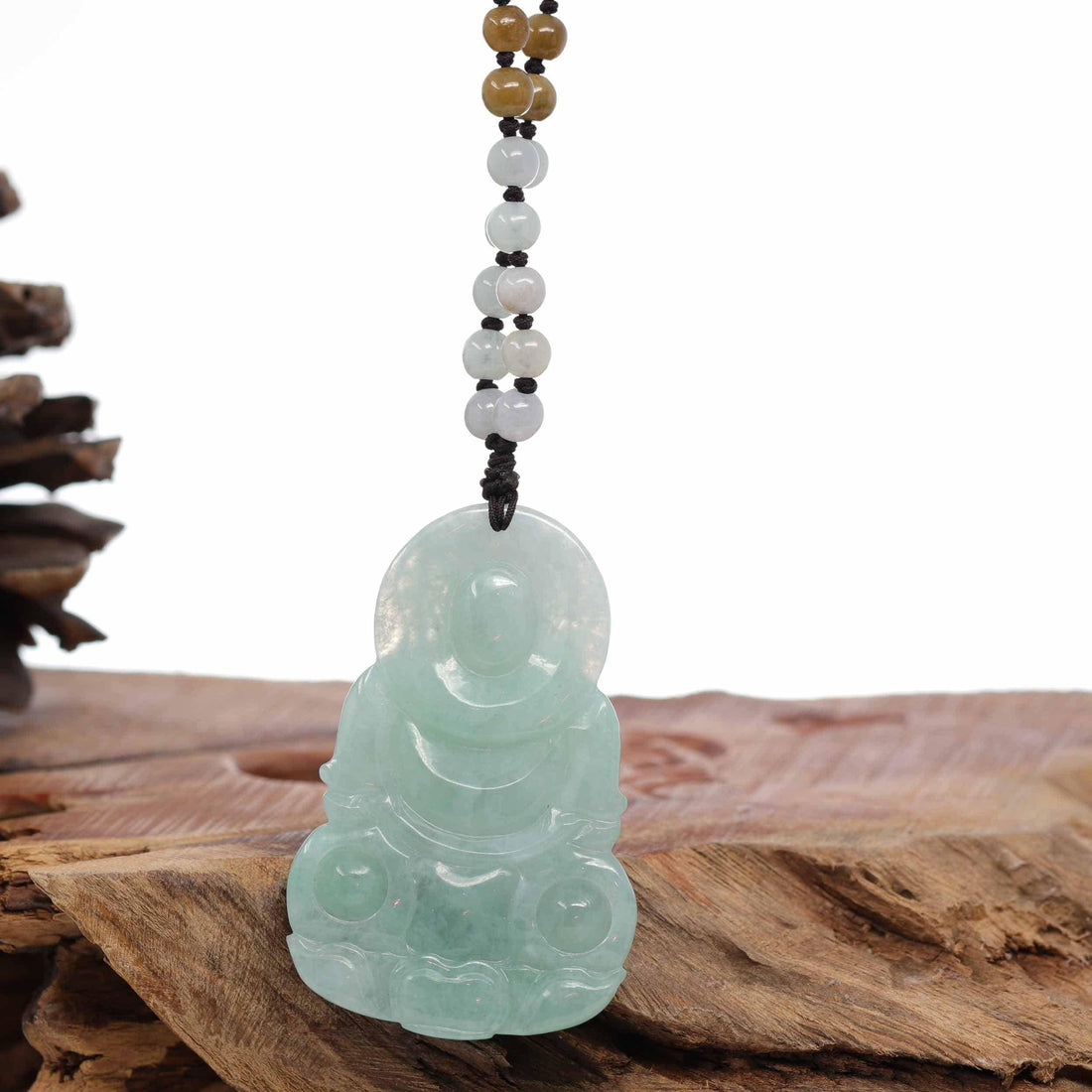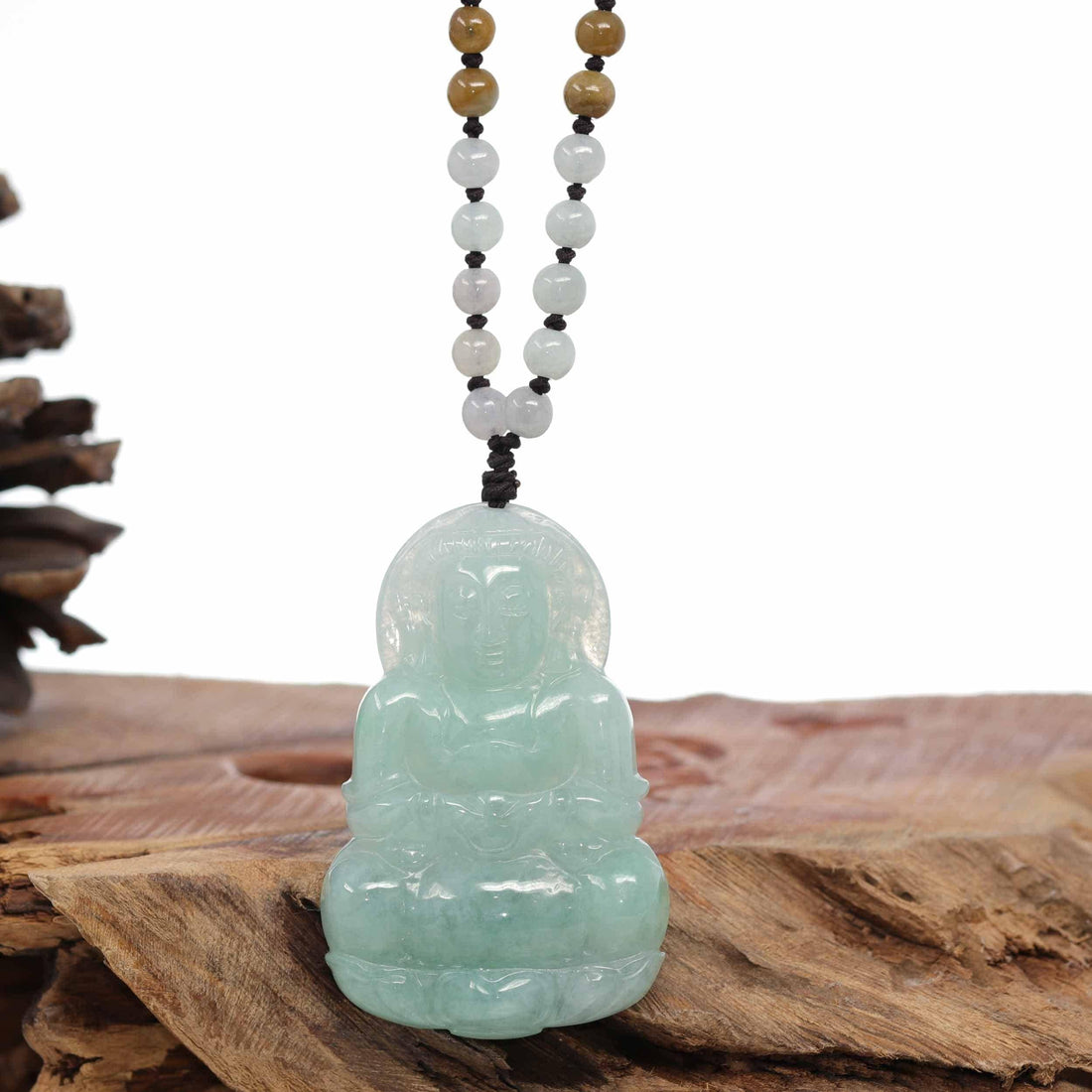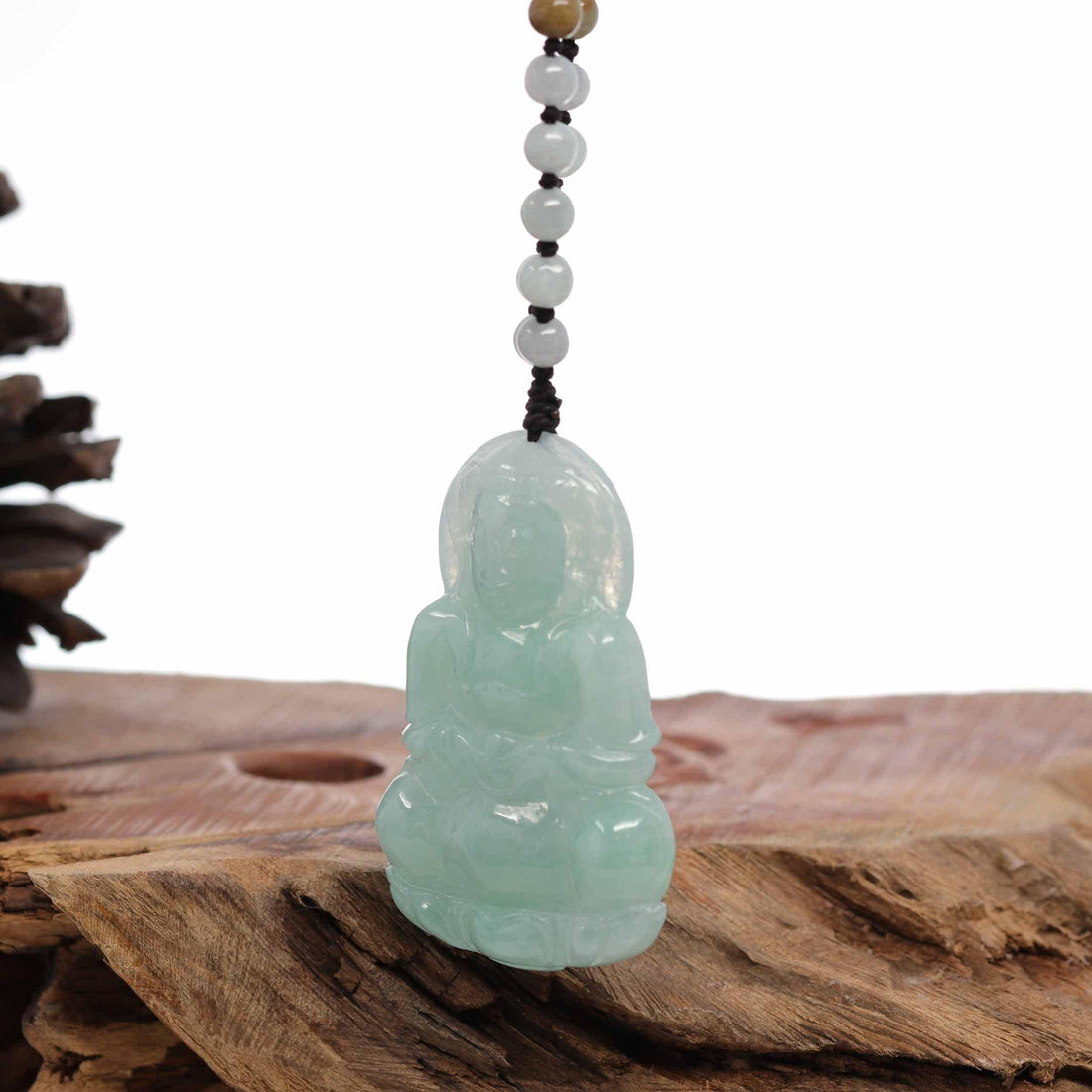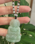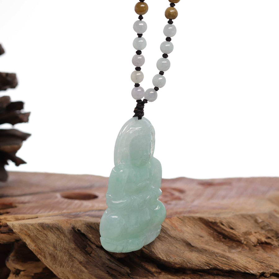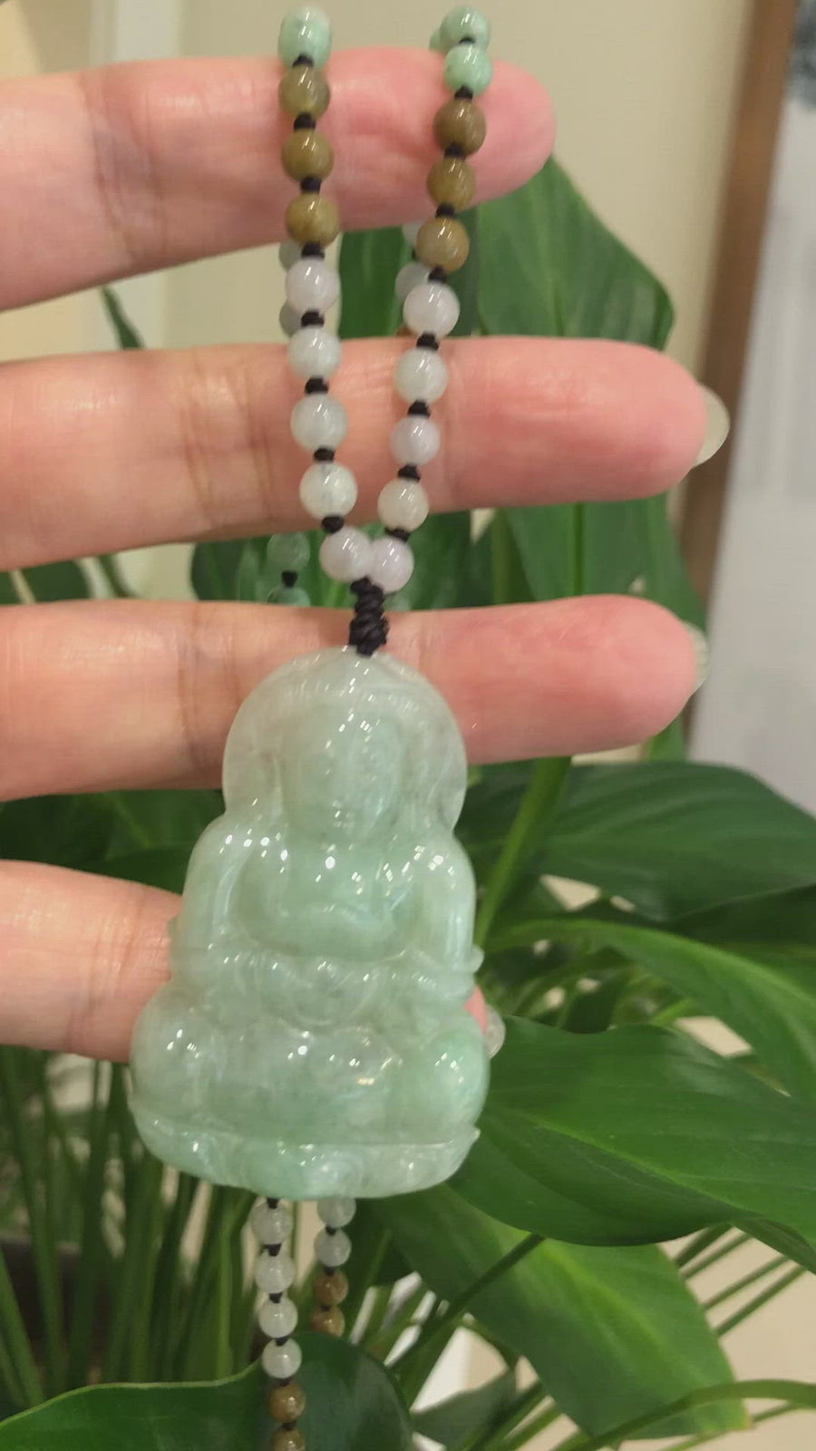 *Design concept--- Made with genuine Burmese ice jadeite jade. The excellent craftsmanship portrays the "goddess of compassion", the Guan Yin. The handcraft is stunning. This particular necklace has some green color, with a very good texture. Great size for both men and women.