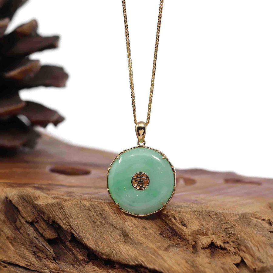 * Design Concept--- The simple shape of a circle represents things such as happiness, wholeness, and prosperity. Or as Sotheby's auction house called a jade bangle. "Circle of Heaven". This necklace is made with very high-quality genuine Burmese lavender jadeite jade. Which produces some of the finest in the world. Refined, exquisite. Very slightly included. Gifting one of these is like wishing the best of luck to your family or loved ones. It's a perfect gift.