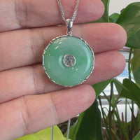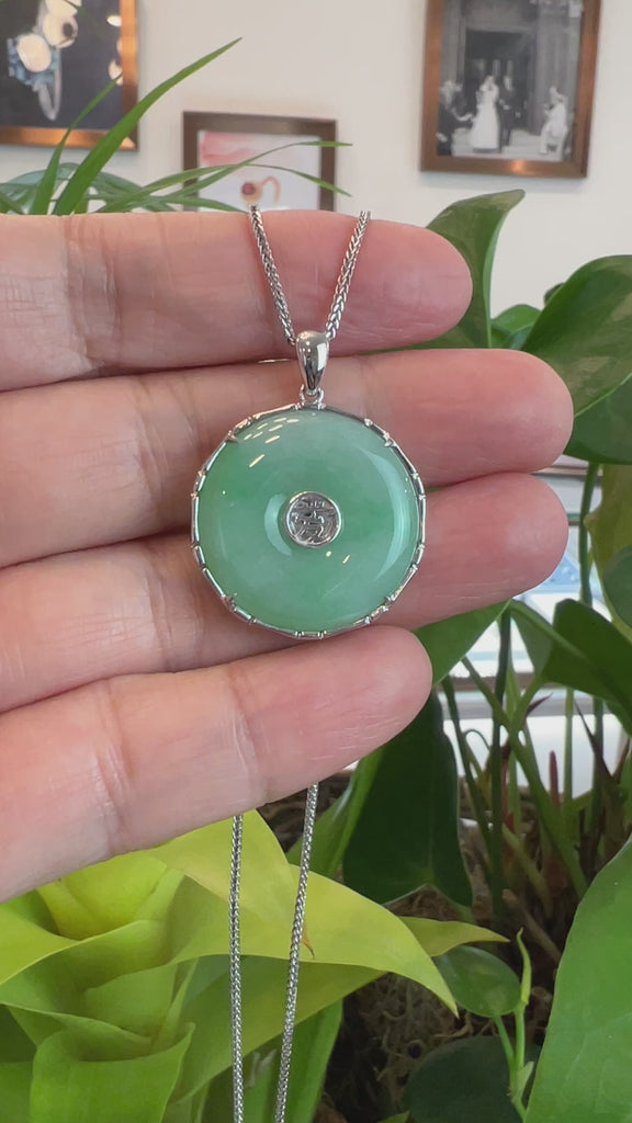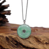 * Design Concept--- The simple shape of a circle represents things such as happiness, wholeness, and prosperity. Or as Sotheby's auction house called a jade bangle. "Circle of Heaven". This necklace is made with very high-quality genuine Burmese green jadeite jade. Which produces some of the finest in the world. Refined, exquisite. Very very slightly included. Gifting one of these is like wishing the best of luck to your family or loved ones. It's a perfect gift.