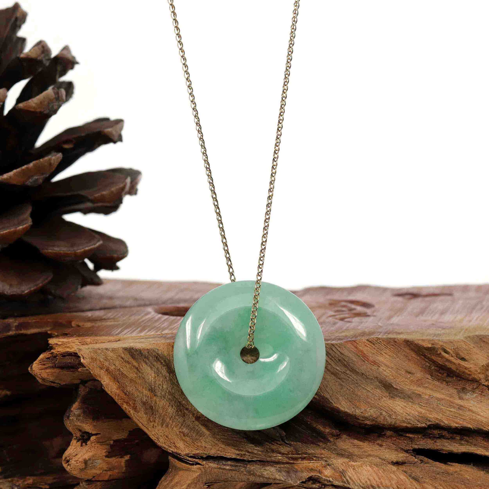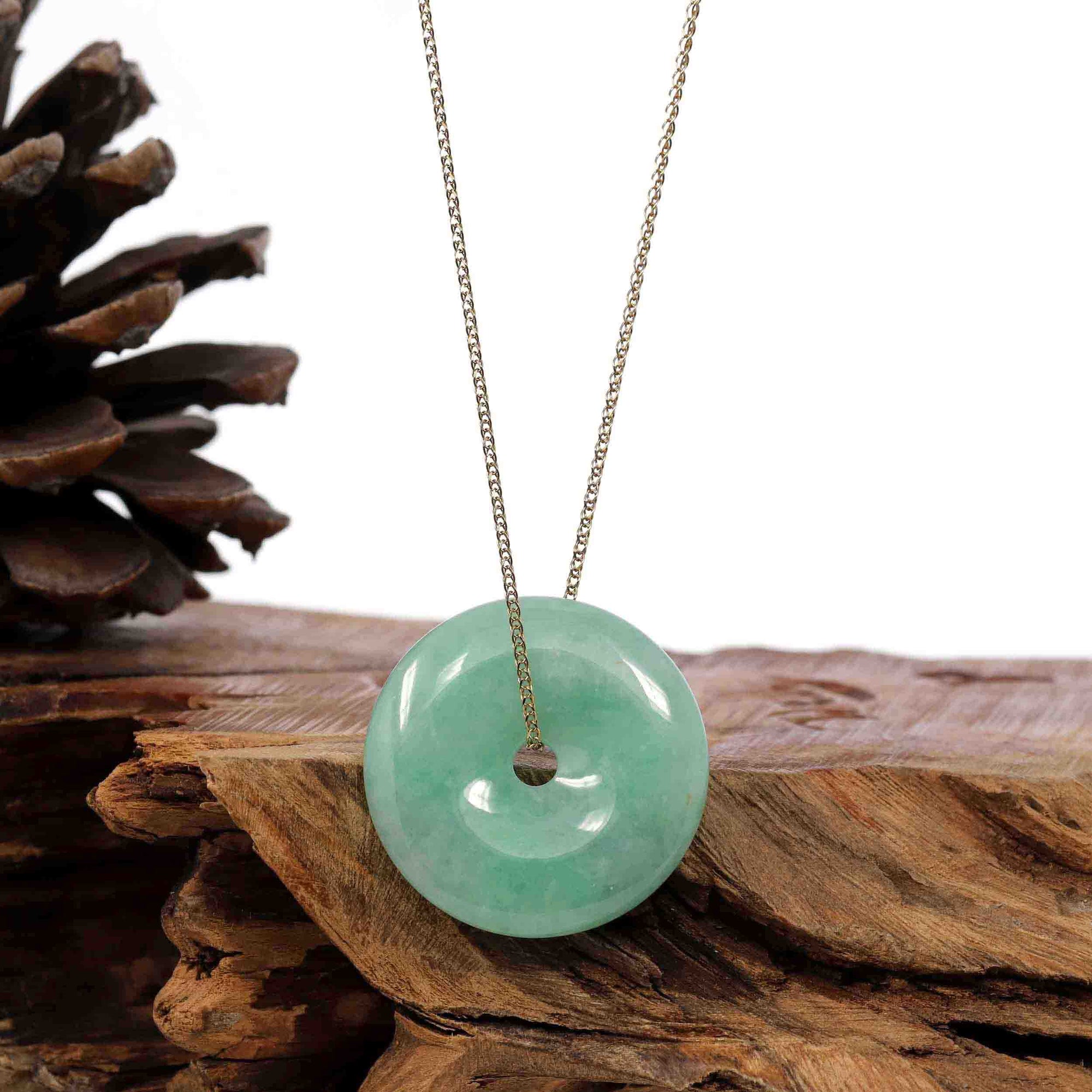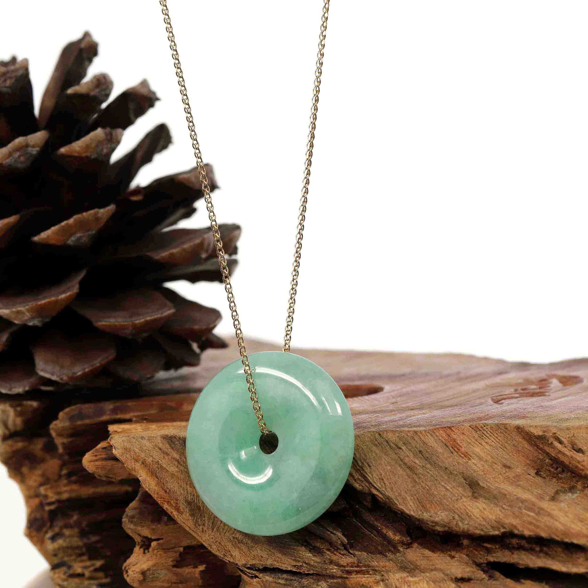 * Design Concept--- The simple shape of a circle represents things such as happiness, wholeness, and prosperity. Or as Sotheby's auction house called a jade bangle. "Circle of Heaven". This necklace is made with very high-quality genuine Burmese green jadeite jade. Which produces some of the fine jade. The texture is very old from the old mine. the green color is good with some yellow, red, brown colors. Gifting one of these is like wishing the best of luck to your family or loved ones. It's a perfect gift.
