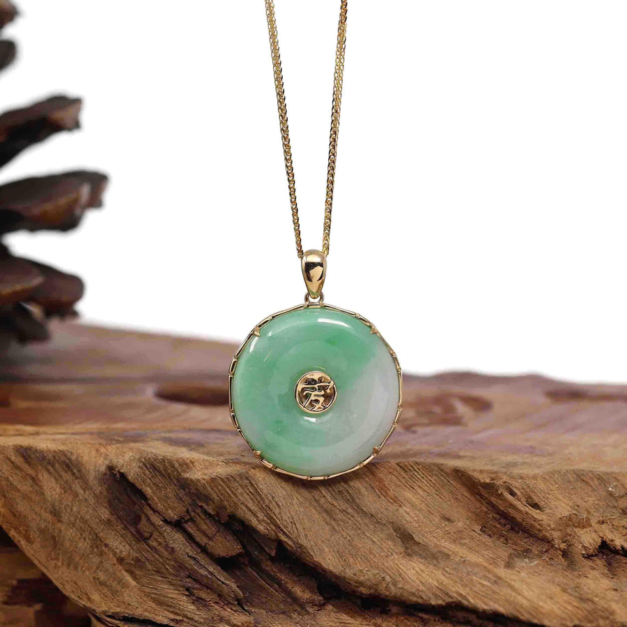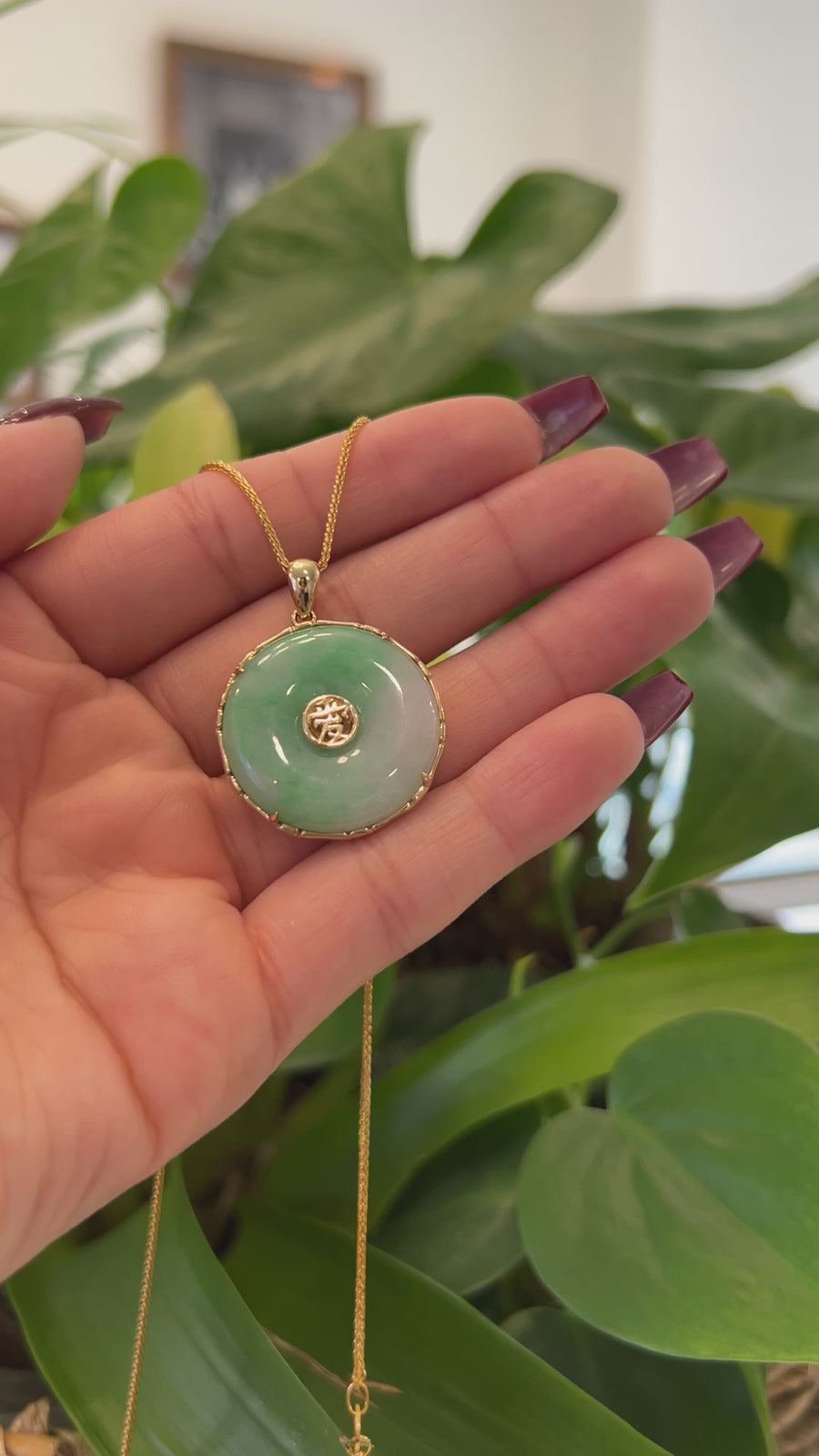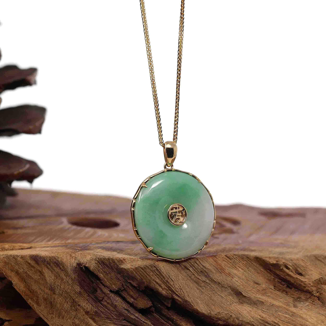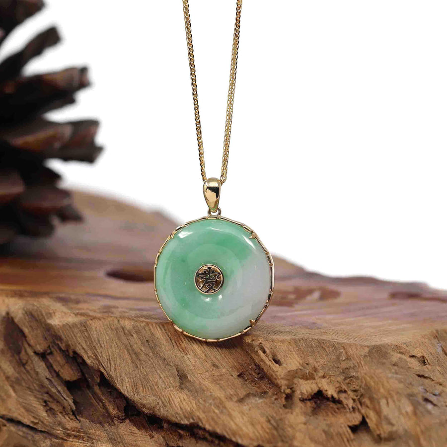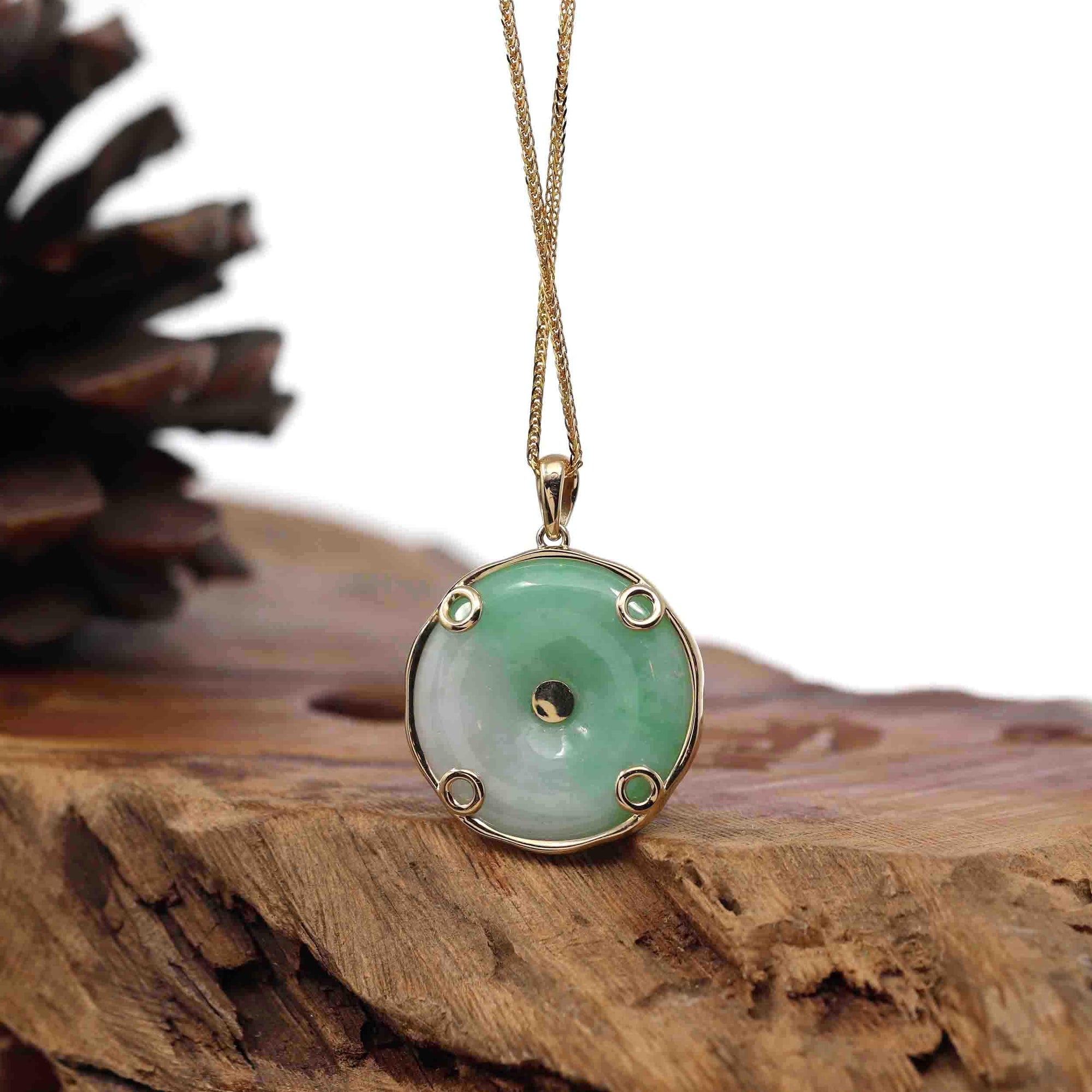 * Design Concept--- The simple shape of a circle represents things such as happiness, wholeness, and prosperity. Or as Sotheby's auction house called a jade bangle. "Circle of Heaven". This necklace is made with very high-quality genuine Burmese lavender jadeite jade. Which produces some of the finest in the world. Refined, exquisite. Very slightly included. Gifting one of these is like wishing the best of luck to your family or loved ones. It's a perfect gift.