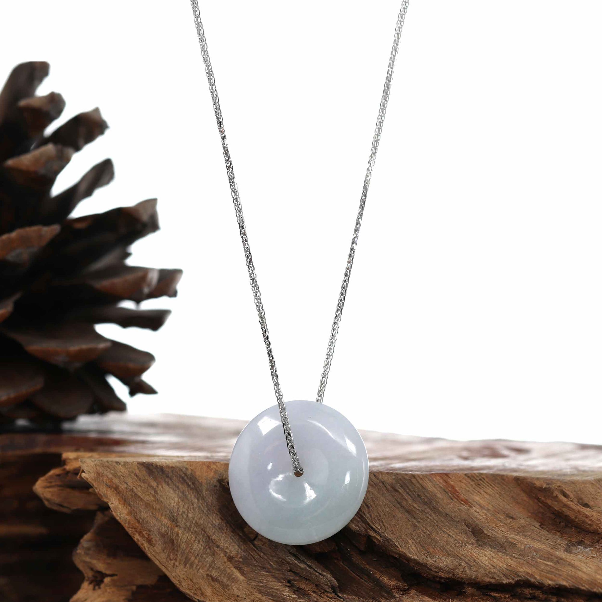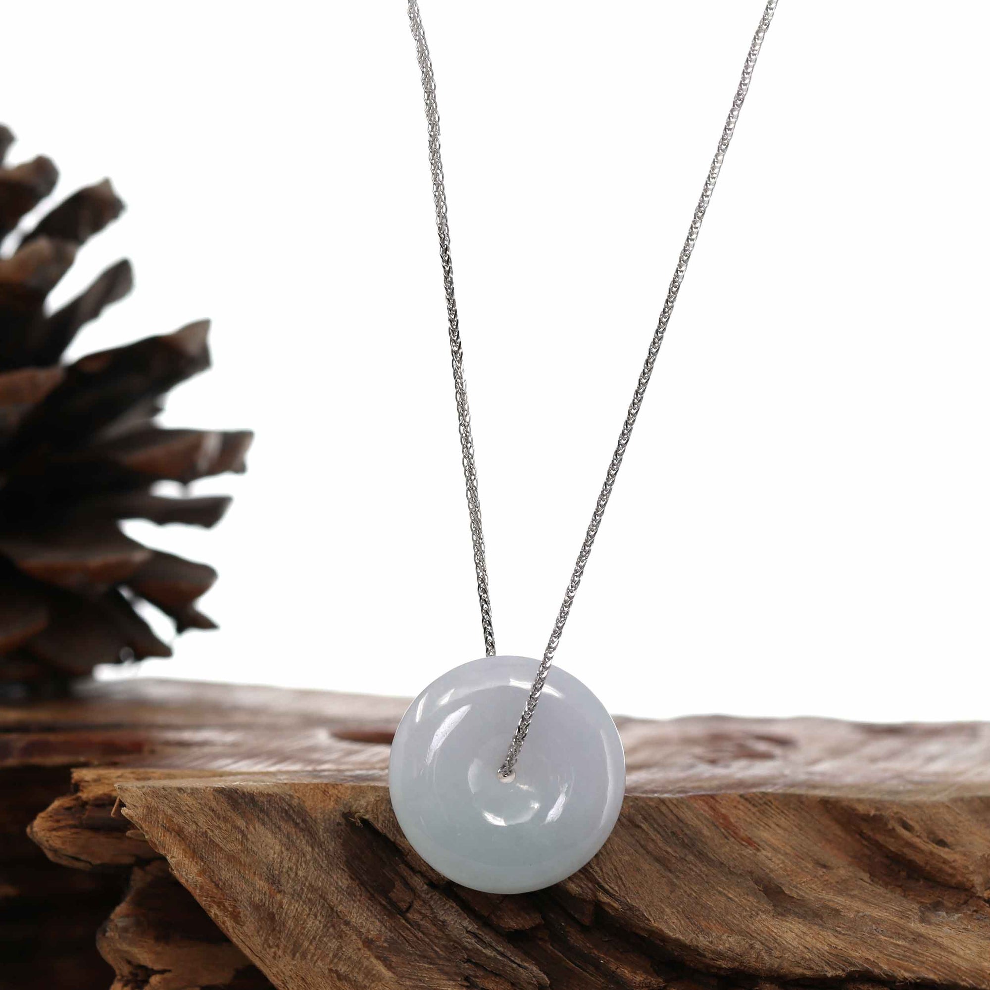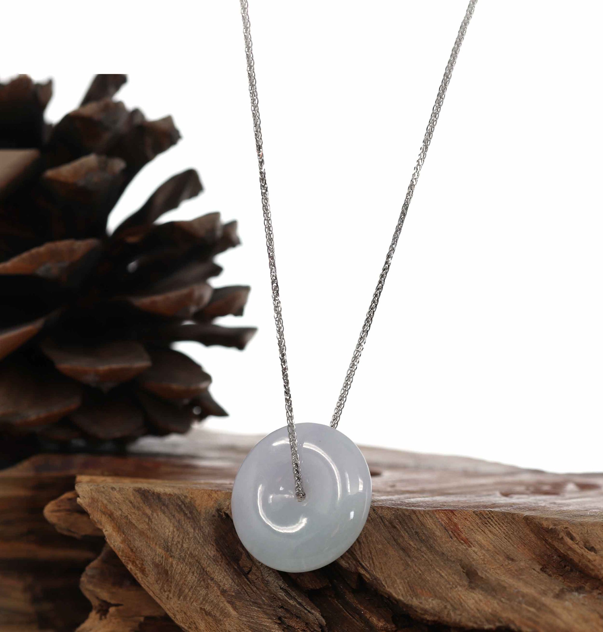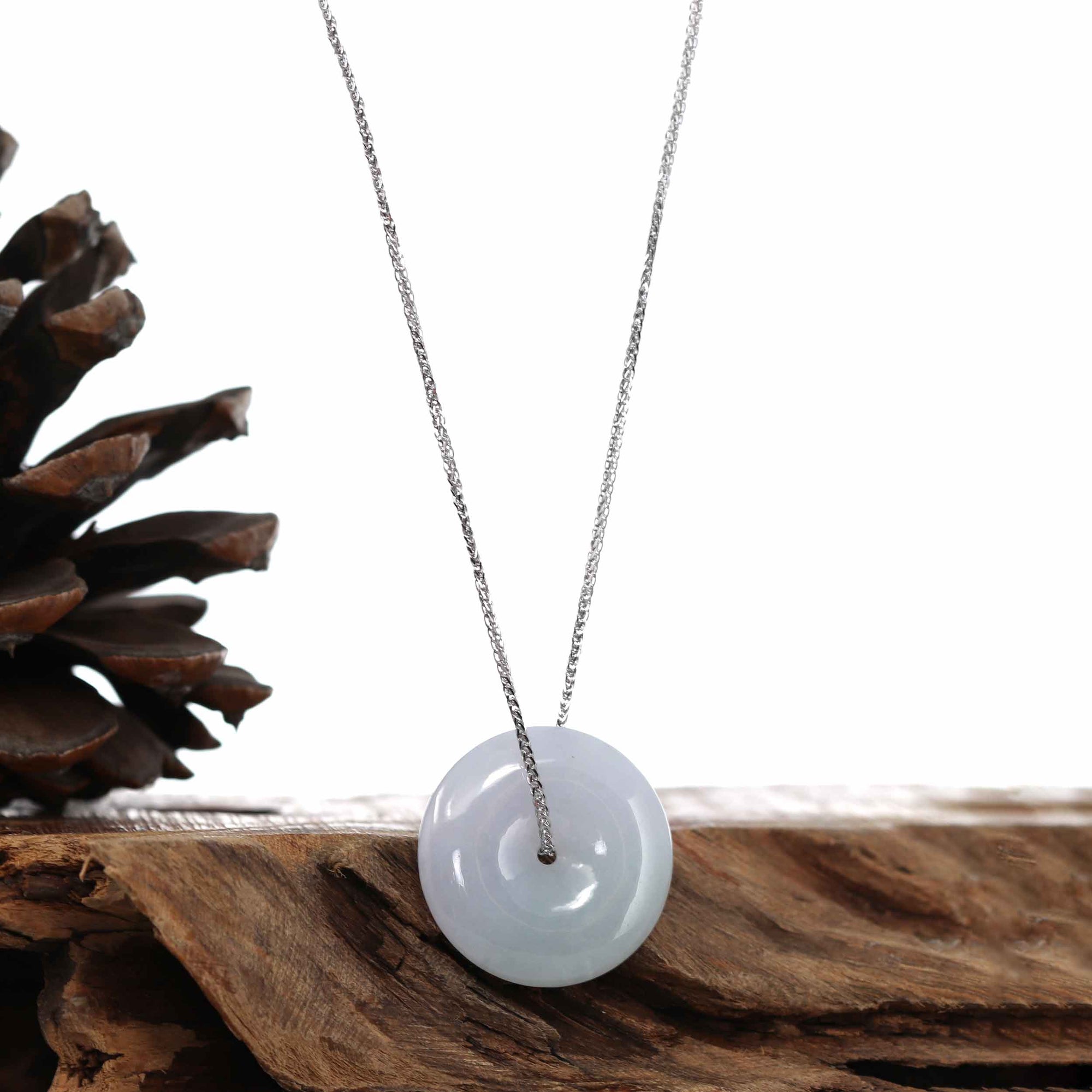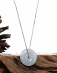 Design Concept--- The simple shape of a circle represents things such as happiness, wholeness, and prosperity. Also known as the "Circle of Heaven". This necklace is made with very high-quality genuine Light Lavender jadeite jade from Burma. Which produces some of the finest in the world. Refined, exquisite. Very very slightly included. Gifting one of these is like wishing the best luck upon your family or loved ones. It's a perfect gift.  ( Similar items sent at random. )