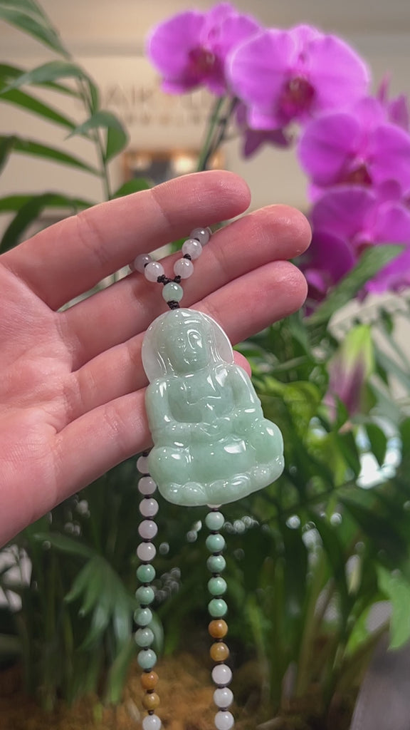* Design Concept--- This pendant is crafted with genuine, natural Burmese jadeite jade in a green color throughout with a multi-color jadeite jade beaded necklace. The pendant is designed in the shape of the Guan Yin "Goddess of Compassion, which symbolizes mercy, protection, and enlightenment. It is believed that Guan Yin watches over and blesses those who wear her image, offering guidance and peace. A meaningful gift for yourself or a loved one.
