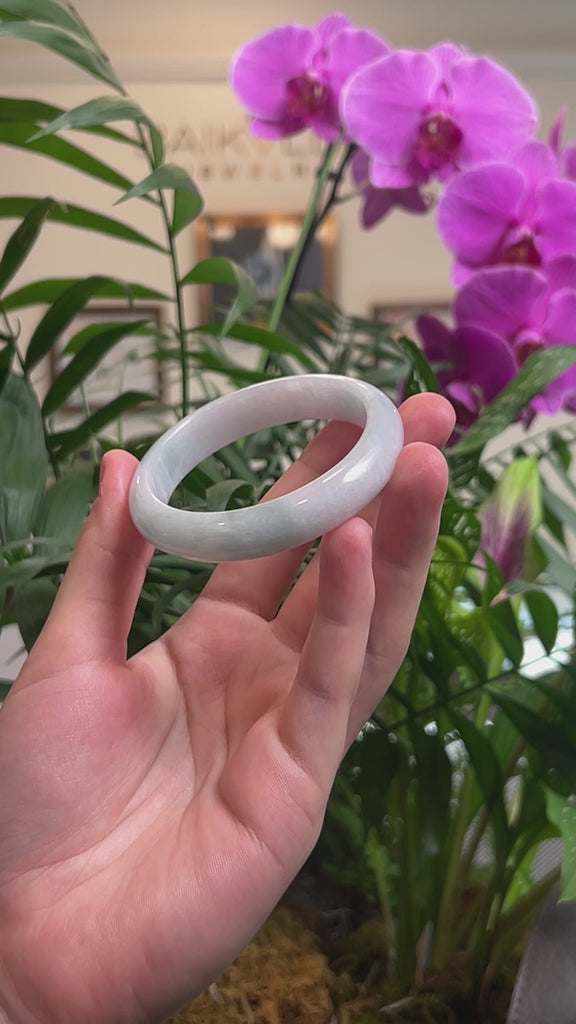 * DETAILS: This bangle is crafted from genuine Burmese Jadeite jade, which features a blend of soft green and white colors throughout. The texture is smooth and translucent with minimal natural lines and cloudy spots. It's a half round, comfort-fit bangle, which is flat on the inside and comfortable for everyday wear. Known for its durability, jadeite is also believed to bring good luck. This bangle makes a thoughtful and meaningful gift for yourself or someone special.
