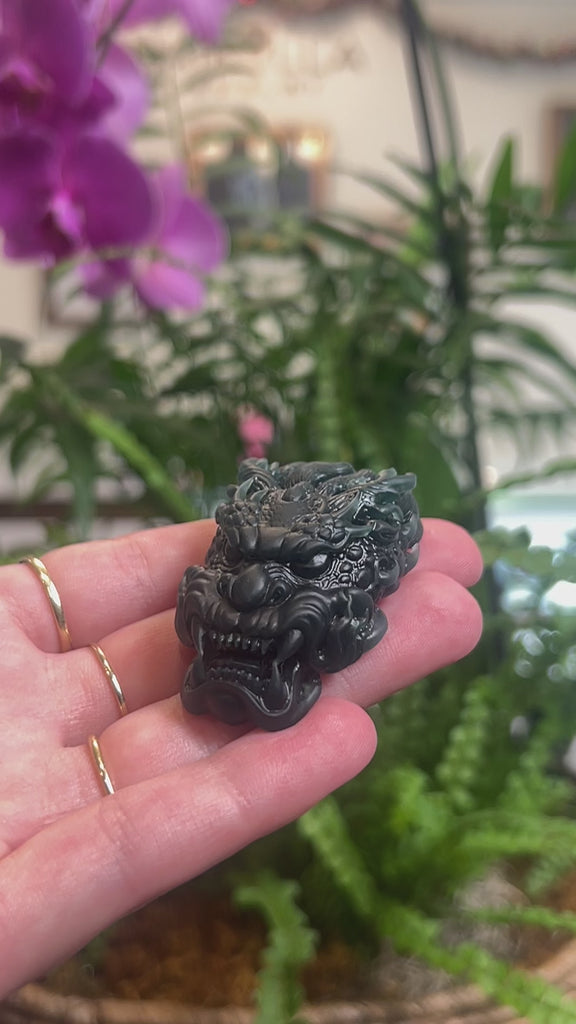 * Design Concept--- This Dragon pendant is masterfully carved from natural Guatemalan jade in a icy deep blue-green color with a matte polished finish. The piece features an intricate carving of a Dragon head.