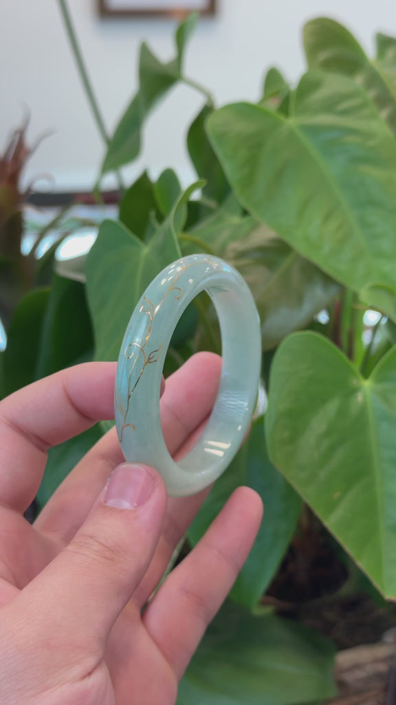 * DETAILS--- This bracelet is crafted from genuine Burmese apple green Jadeite Jade with 18k gold inlays. The jade’s texture is very smooth and translucent, featuring a captivating light apple green color through out, with some natural lines and very little small cloudy spots. The bangle has good translucency and beautiful very smooth texture. With 18k yellow gold inlay through out the bangle, the inlay is usually done to mask natural inclusions. The gold inlay are guaranteed for life, but proper care is required for the bangle. The bangle has a classic half-round style that enhances its elegance also offers comfort, making it a perfect piece for jade lovers and collectors alike. Smaller size bangle. It's a very unique bangle for yourself or your love. It's a collectible item.