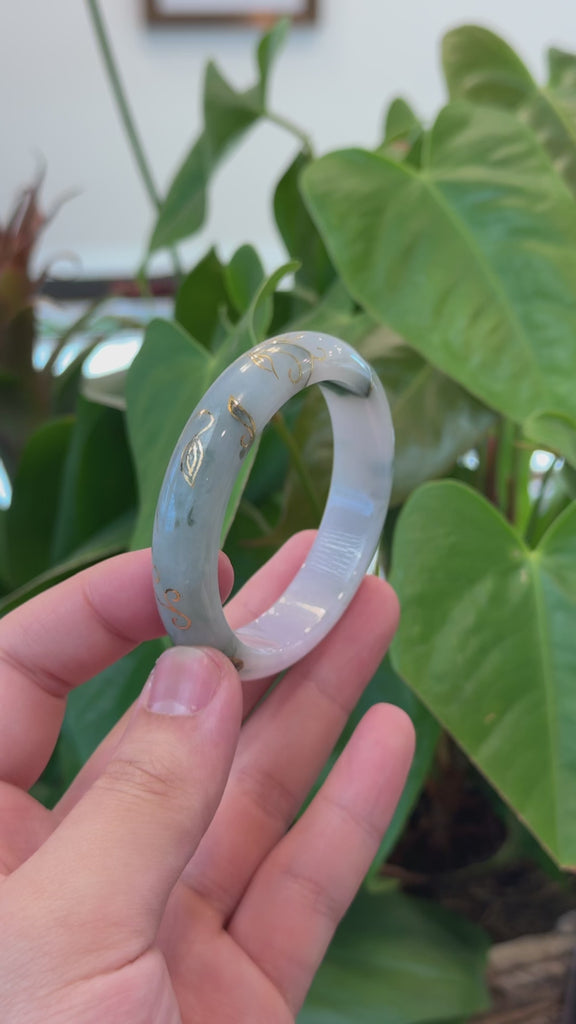 * DETAILS--- This bracelet is crafted from genuine Burmese blue green Jadeite Jade with 18k gold inlays. The jade’s texture is very smooth and translucent, featuring a captivating blue green patches and lavender color between, with no natural lines and very little small cloudy spots. The bangle has good translucency and beautiful very smooth texture. With 18k yellow gold inlay through out the bangle. The gold inlay are guaranteed for life (conditions apply), but proper care is required for the bangle. The bangle has a classic half-round style that enhances its elegance also offers comfort, making it a perfect piece for jade lovers and collectors alike. Smaller size bangle. It's a very unique bangle for yourself or your love. It's a collectible item.