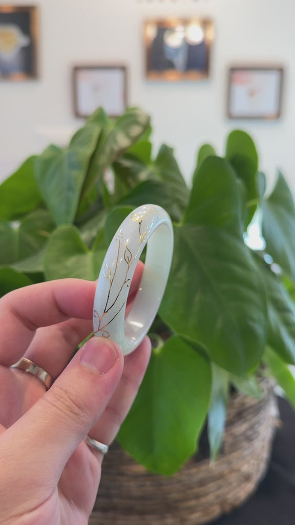 * DETAILS--- This bracelet is crafted from genuine Burmese lavender green Jadeite Jade with 18k gold inlays. The jade’s texture is very smooth and semi translucent, featuring a captivating light green and lavender color through out, with some natural lines and very little small cloudy spots. The bangle has good translucency and beautiful very smooth texture. With 18k yellow gold inlay through out the bangle, the inlay is usually done to mask natural inclusions. The gold inlay are guaranteed for life, but proper care is required for the bangle.  The bangle has a classic half-round style that enhances its elegance also offers comfort, making it a perfect piece for jade lovers and collectors alike. Smaller size bangle. It's a very unique and fashion bangle for yourself or your love. It's a collectible item.