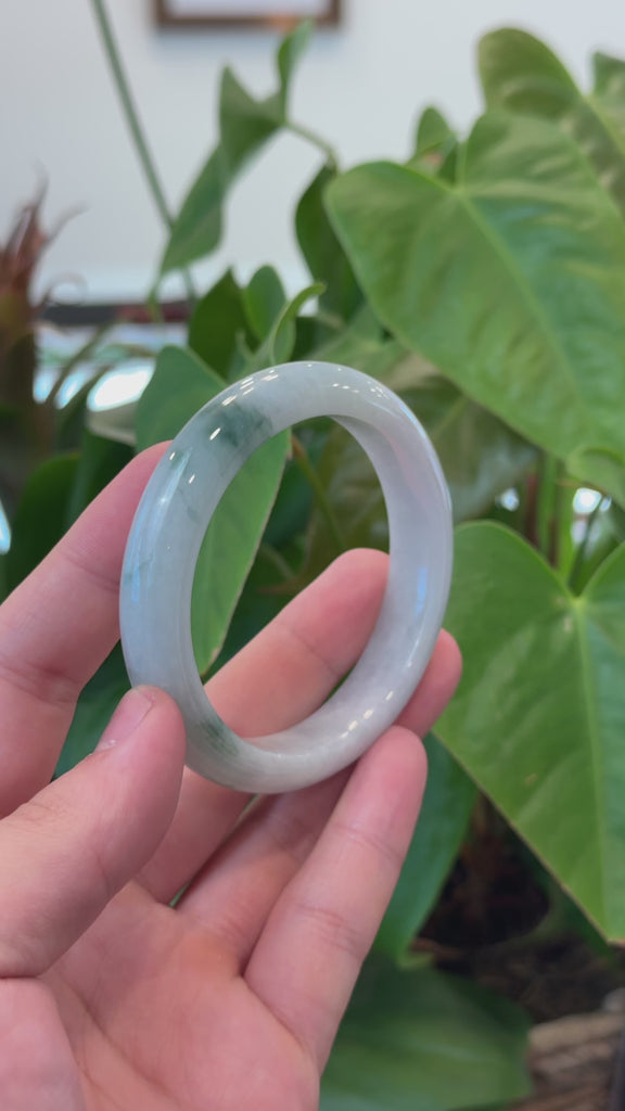 * DETAILS--- This bracelet is crafted from quality, genuine Burmese blue-green Jadeite Jade with patchs of "floating" blue green color. The jade’s texture is semi smooth and semi translucent, featuring a captivating blue green color mostly on one side, with no natural lines and very little small cloudy spots. The bangle has good semi translucency and beautiful fine texture. The bangle has a classic half-round style that enhances its elegance also offers comfort, making it a perfect piece for jade lovers and collectors alike. Larger size bangle.
