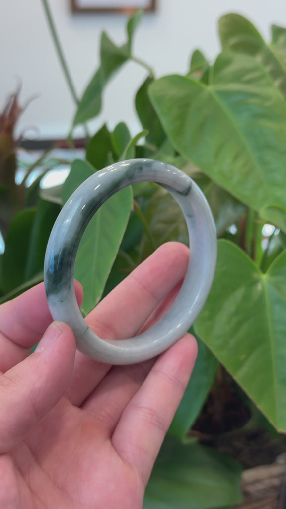 * DETAILS--- This bracelet is crafted from quality, genuine Burmese blue-green Jadeite Jade with a patch of intense "floating" blue green color. The jade’s texture is smooth and semi translucent, featuring a captivating blue green color mostly on one side, with no natural lines and no cloudy spots. Mostly characterized by the strong blue-green color. The bangle has good semi translucency and beautiful semi fine texture. Harder to come by at larger size. The bangle has a classic half-round style that enhances its elegance also offers comfort, making it a perfect piece for jade lovers and collectors alike. Larger size bangle.