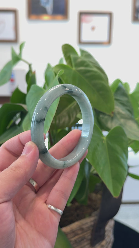 * DETAILS--- Genuine Burmese Jadeite Jade Bangle Bracelet. This bangle is made with high-quality genuine Burmese Ice blue-green Jadeite jade, The jade texture is so smooth and translucent. The blue-green color and translucent inlaid with 18k rose gold flowers, truly a mesmerizing combination. The Classic half-round style bracelet with rose gold morning glory flowers carvings in the cracks. this bangle looks completely beautiful with blue-green. It is a wider size bangle. It's a very unique bangle for yourself or your love. It's a collectible item.