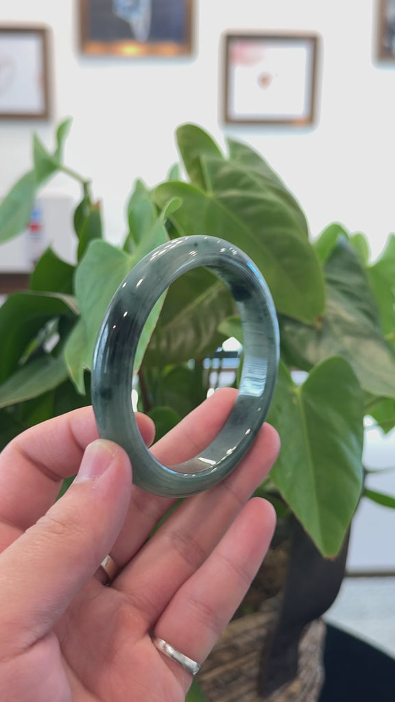 * DETAILS--- Genuine Burmese Jadeite Jade Bangle Bracelet. This bangle is made with high-quality genuine Burmese Ice blue-green Jadeite jade, The jade texture is so icy and translucent with very small cloudy spots. The blue-green color and translucency is truly a mesmerizing combination. The Classic half-round style bangle looks completely beautiful with deep blue-green. It's a very unique bangle for yourself or your love. It's a collectible item.