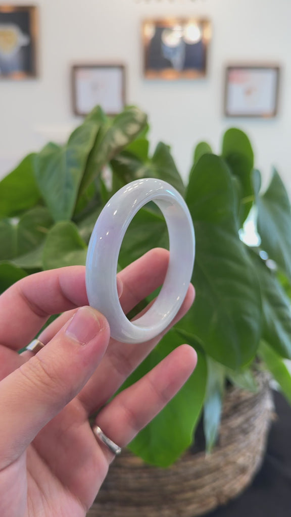 * DETAILS--- This bracelet is crafted from quality, genuine Burmese blue-green lavender Jadeite Jade with a large patch of beautiful lavender color. The jade’s texture is smooth and semi translucent, featuring a captivating lavender color mostly on one side and light green on the other, with no natural lines and very little small cloudy spots. The bangle has good semi translucency and beautiful fine texture. The bangle has a classic half-round style that enhances its elegance also offers comfort, making it a perfect piece for jade lovers and collectors alike.