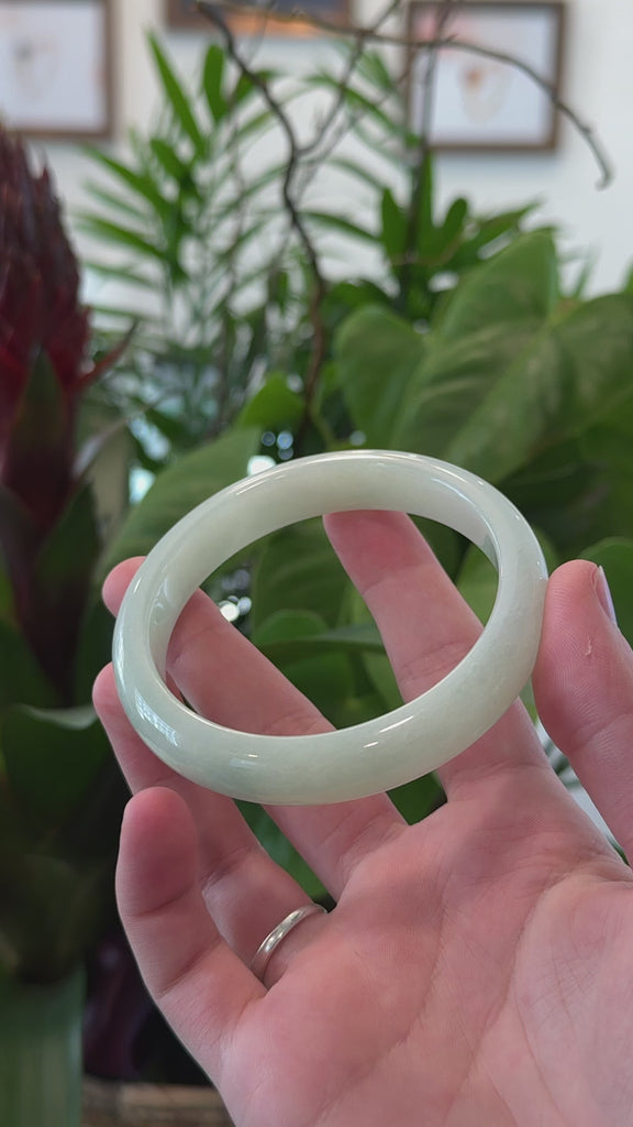 * DETAILS--- This exquisite bangle is crafted from premium Burmese Jadeite in a light green hue. With its smooth, even texture and captivating color, it radiates a timeless elegance and cultural heritage. Also pretty rare at the larger size. The classic half-round comfort design enhances the jade’s natural beauty with simplicity, making this bracelet a cherished addition to any jewelry collection. Only a little bit of natural lines inside, not visible by everyday light. This bangle has such a lovely color making this piece a thoughtful, one-of-a-kind gift for yourself or someone truly special.