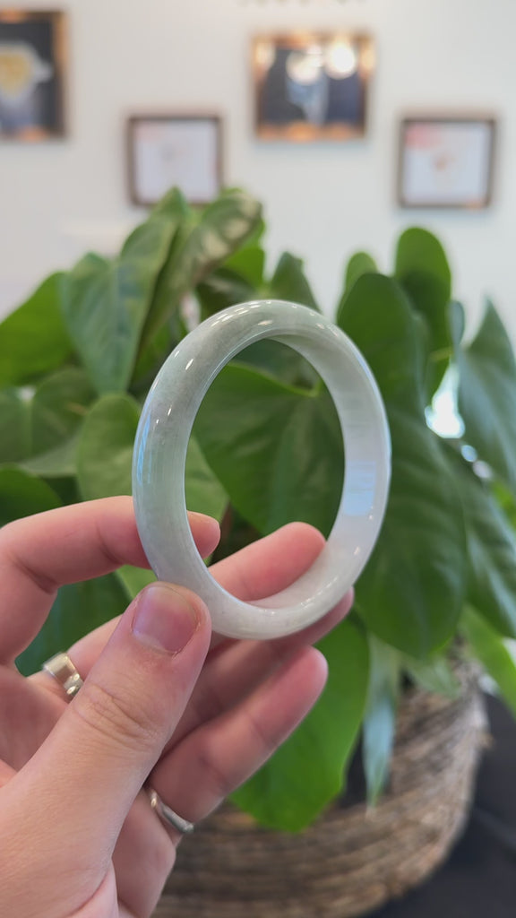 * DETAILS--- This exquisite bangle is crafted from premium Burmese jadeite in a light green hue. With its smooth, translucent texture and captivating color, it radiates a timeless elegance and cultural heritage. The classic half-round comfort design enhances the jade’s natural beauty with simplicity, making this bracelet a cherished addition to any jewelry collection. just has some clouds and inclusion, Known to symbolize protection and strength, jade bangles hold deep meaning, making this piece a thoughtful, one-of-a-kind gift for yourself or someone truly special.