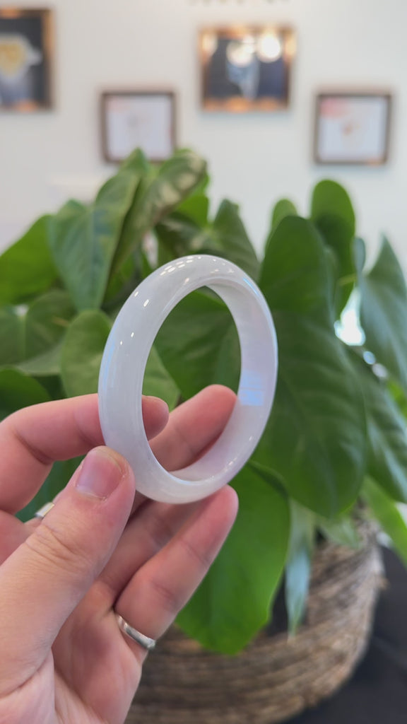 * DETAILS--- This exquisite bangle is crafted from premium Burmese ice jadeite in a lavender green hue. With its smooth, translucent texture and captivating color, it radiates a timeless elegance and cultural heritage. The classic half-round comfort design enhances the jade’s natural beauty with clarity and simplicity, making this bracelet a cherished addition to any jewelry collection. Known to symbolize protection and strength, jade bangles hold deep meaning, making this piece a thoughtful, one-of-a-kind gift for yourself or someone truly special.