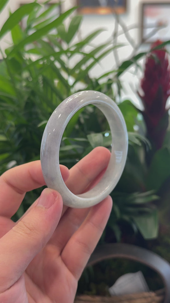 * DETAILS--- This exquisite bangle is crafted from premium Burmese jadeite in a light lavender hue. With its smooth, translucent texture and captivating color, it radiates a timeless elegance and cultural heritage. The classic half-round comfort design enhances the jade’s natural beauty with simplicity, making this bracelet a cherished addition to any jewelry collection. just has some clouds and inclusion, Known to symbolize protection and strength, jade bangles hold deep meaning, making this piece a thoughtful, one-of-a-kind gift for yourself or someone truly special.