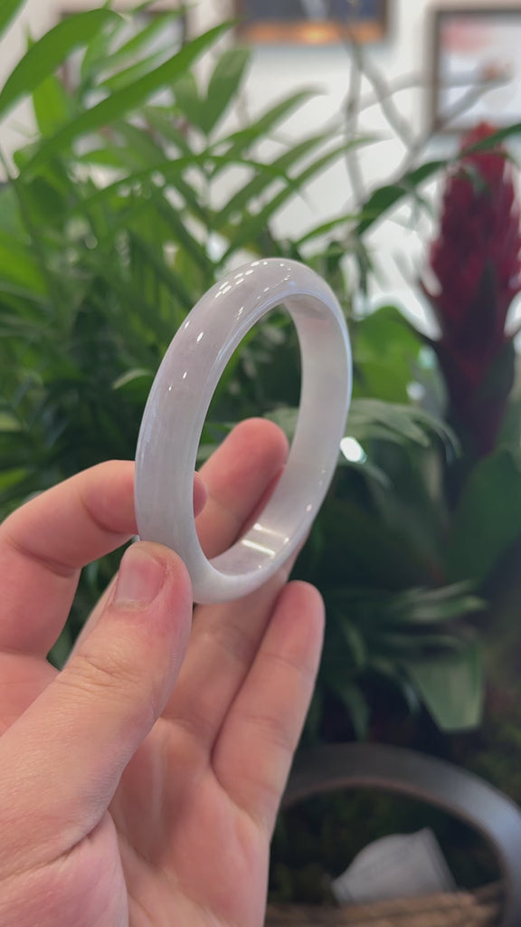 * DETAILS--- This exquisite bangle is crafted from premium Burmese jadeite in a light lavender hue. With its smooth, translucent texture and captivating color, it radiates a timeless elegance and cultural heritage. The classic half-round comfort design enhances the jade’s natural beauty with simplicity, making this bracelet a cherished addition to any jewelry collection. just has some clouds and inclusion, Known to symbolize protection and strength, jade bangles hold deep meaning, making this piece a thoughtful, one-of-a-kind gift for yourself or someone truly special.