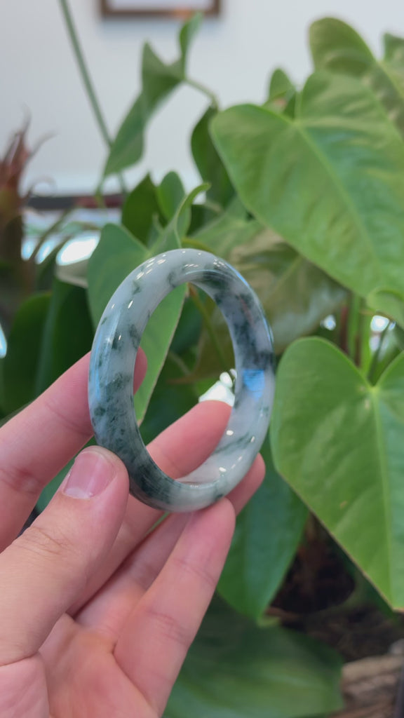 * DETAILS--- This bracelet is crafted from quality, genuine Burmese blue-green Jadeite Jade with patches of unique "floating" blue green color. The jade’s texture is smooth and semi translucent, featuring a captivating deep blue green color mostly through out, with no natural lines and very little small cloudy spots. The bangle has good semi translucency and beautiful fine texture. The bangle has a classic half-round style that enhances its elegance also offers comfort, making it a perfect piece for jade lovers and collectors alike. Larger size bangle.
