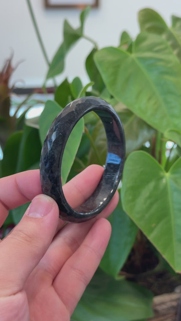 * DETAILS--- This stunning bangle is made from genuine Burmese WuJi "乌鸡" Jadeite jade, featuring a deep black color with unique grey speckles. Inspired by the WuJi chicken, it has a distinctive look. The diamond-cut design adds a brilliant shine, like a black diamond bangle. Simple yet elegant, it's a special gift for yourself or someone special.