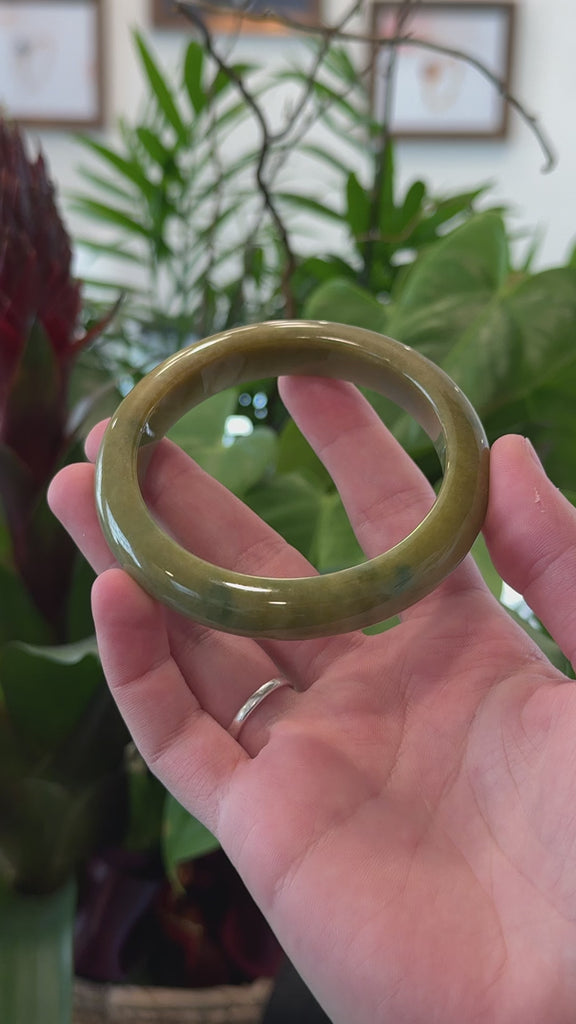 * DETAILS--- This exquisite bangle is crafted from premium Burmese Jadeite in a light green and deep yellow/ brown mixed hue. With its smooth, translucent texture and absolutely  captivating color, it radiates a timeless elegance and cultural heritage. The classic half-round comfort design enhances the jade’s natural beauty with simplicity. The bangle also has very smooth texture. This bangle has such a unique  color mix making this piece a thoughtful, one-of-a-kind gift for yourself or someone truly special.