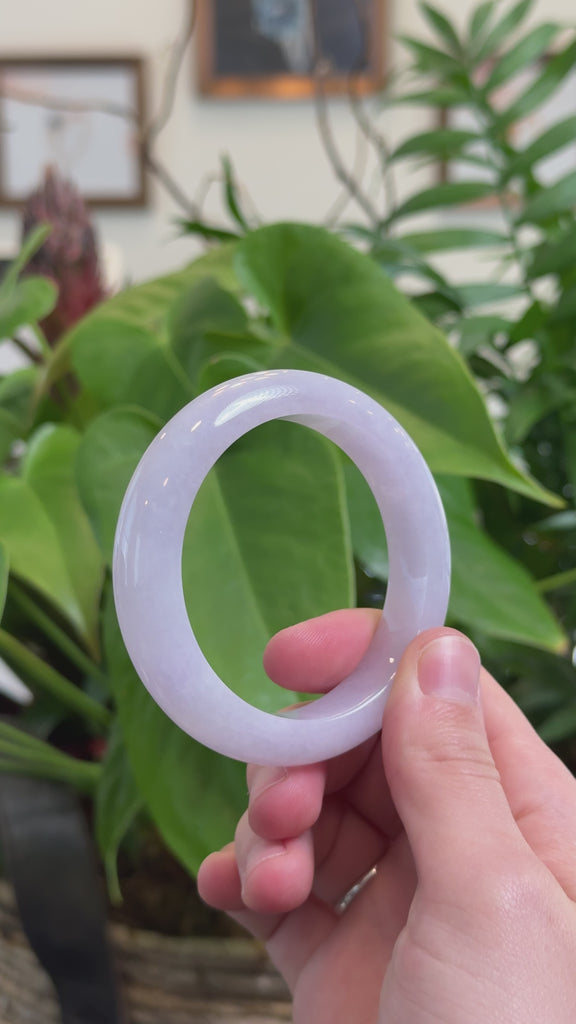 * DETAILS--This bangle is made from high-quality genuine Burmese Jadeite jade. It has a very smooth & translucent texture with a beautiful pink-lavender color throughout. The classic half-round design offers comfort and style. Jadeite jade is one of the toughest gemstones, and it's believed to bring good luck. This bangle makes a special gift for you or a loved one.