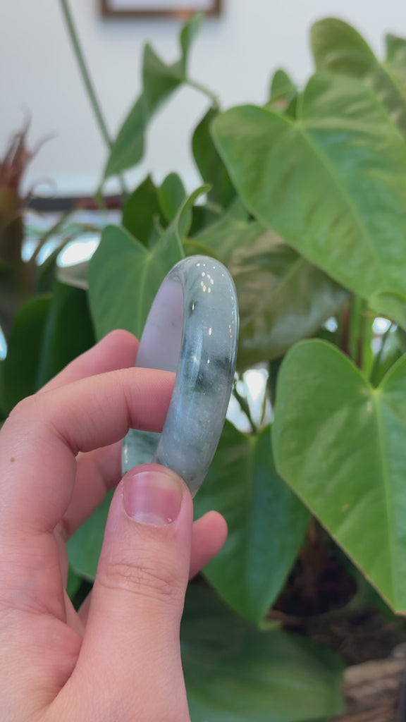 * DETAILS--- This bracelet is crafted from high quality, genuine Burmese icy blue-green Jadeite Jade with patches of "floating" blue green and lavender color. The jade’s texture is smooth and icy translucent, featuring a captivating blue green color through out with lavender. With no natural lines and some cloudy white spots and black spots in the lavender. Adding natural uniqueness to the bangle. The bangle has great icy translucency and beautiful fine texture. Wider width at 15mm. The bangle has a classic full-round style that enhances its elegance also offers comfort, making it a perfect piece for jade lovers and collectors alike.