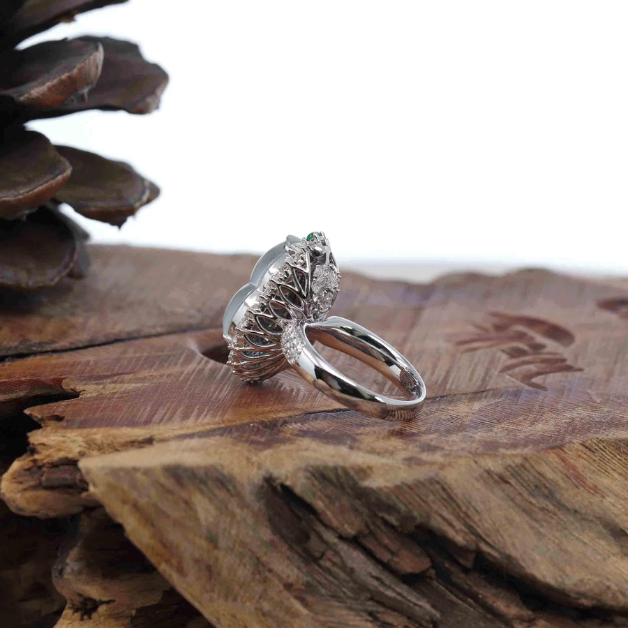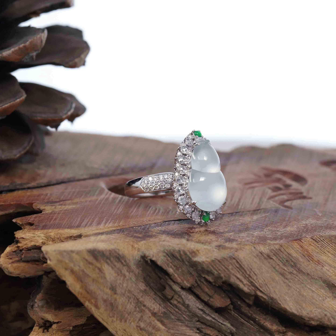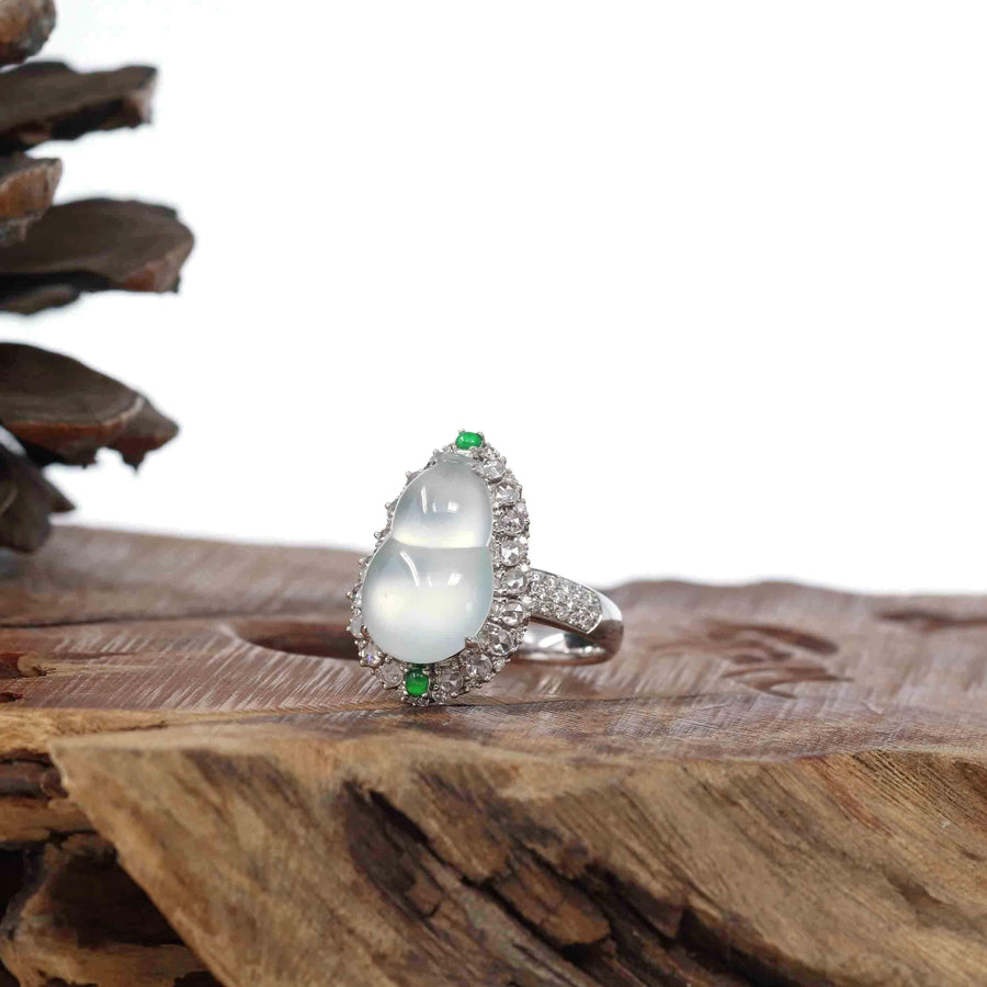 This ring features a "Hulu" Bottle Gourd shaped ice Jadeite. "Hulu" (葫芦) is a Chinese term that translates to "gourd" in English. A common symbol in Chinese culture representing good luck, longevity, and prosperity.The essence of this ice jadeite is unleashed by the strikingly brilliant diamonds and the simplistic yet intricate setting design that keeps the originality of the rare jadeite jade. Color is photographed exactly to the actual stone, it's free of any inclusions that are visible to the naked eye.