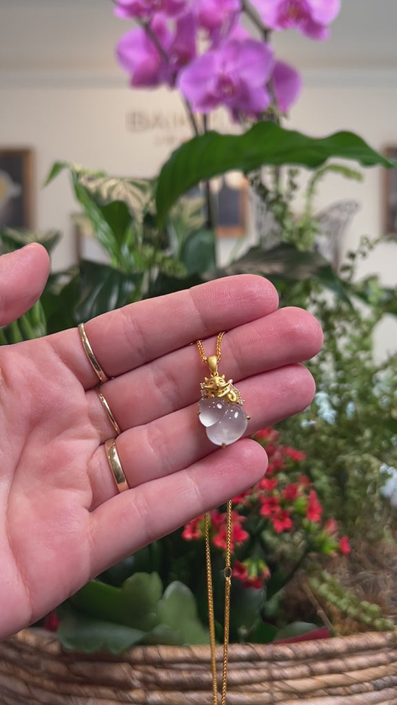* Design Concept--- This "Hulu" Bottle Gourd pendant features genuine Burmese Jade in a beautiful icy white color throughout. The jade texture in smooth & translucent with no natural lines and some natural cloudy spots. The pendent is set in 18K Yellow Gold with a fox themed bail that is dazzled with natural diamonds. "Hulu" (葫芦) is a Chinese term that translates to "gourd" in English. A common symbol in Chinese culture representing good luck, longevity, and prosperity. This pendant makes the perfect gift for yourself or your loved ones.