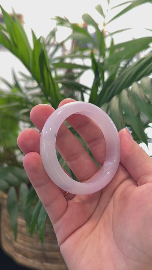 * DETAILS--- This bangle is crafted from genuine Burmese Jadeite jade. It features a very smooth, very translucent texture with light lavender colors that looks very beautiful and unique. With some natural lines that run length-wise (does not affect durability or structure of the bangle) and minimal cloudy texture. It's a half round, comfort-fit bangle, which is flat on the inside of the bangle and comfortable for everyday wear. Known for its durability, jadeite is also believed to bring good luck. This bangle makes a thoughtful and meaningful gift for yourself or someone special.