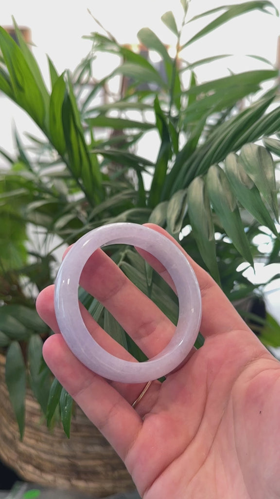 * DETAILS--- This bangle is crafted from genuine Burmese Jadeite jade. It features a semi smooth, translucent texture with lavender colors throughout that look very beautiful and unique. With a portion of the bangle that is faint green. The bangle has some white cloudy spots through out the whole bangle and one natural line that runs length wise (doesn't affect the durability/ structure of the bangle). It's a half round, comfort-fit bangle, which is flat on the inside of the bangle and comfortable for everyday wear. Known for its durability, jadeite is also believed to bring good luck. This bangle makes a thoughtful and meaningful gift for yourself or someone special.